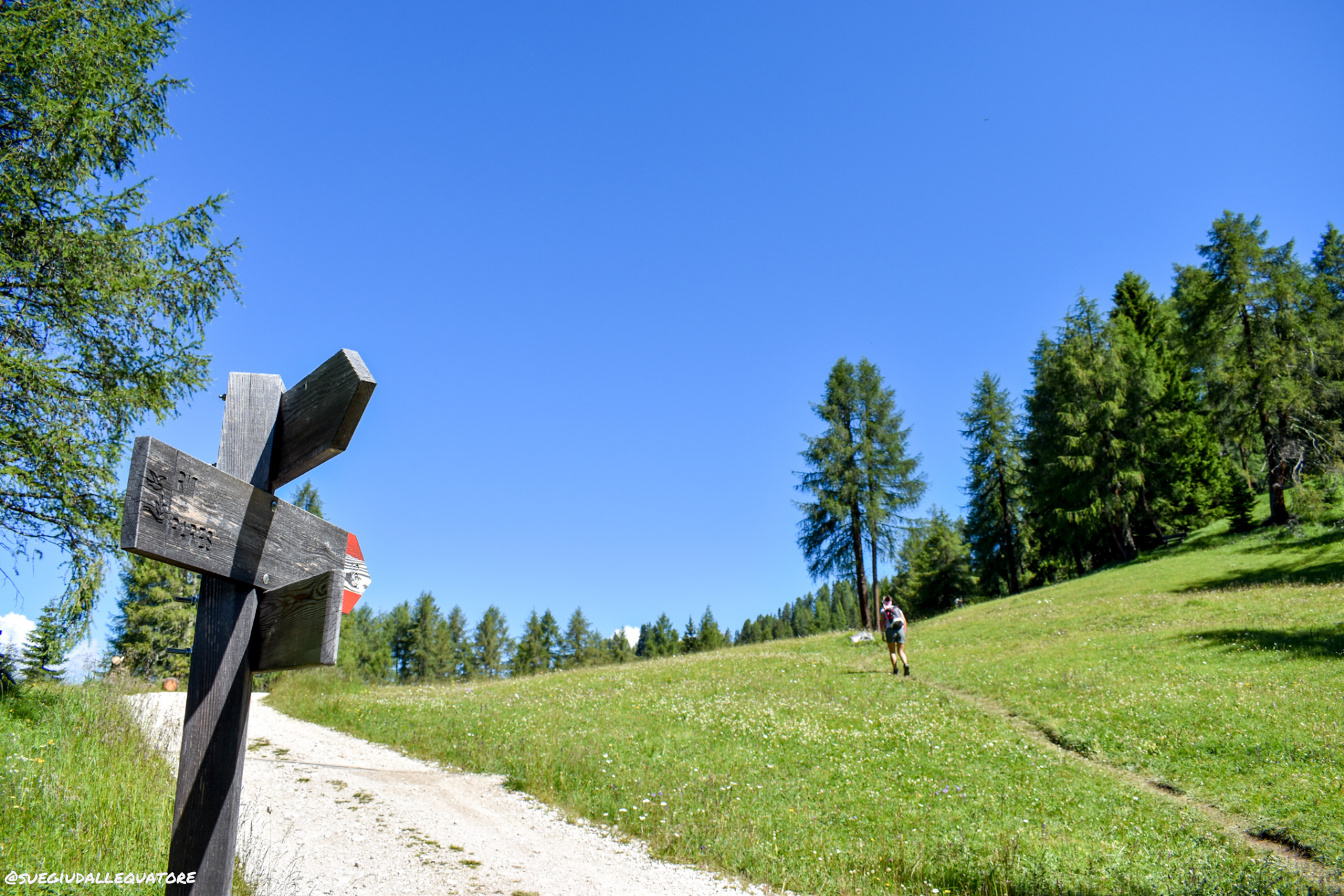 Proseguite fino a trovare uno spiazzo con un altro piccolo parcheggio (volendo potrete parcheggiare anche qui) dove inizierà il percorso nel sottobosco. Il sentiero da prendere è il n°16 (Piz de Pares-Rit).Qui i raggi del sole entrano tra gli alberi e vi regaleranno dei bellissimi giochi di luce e colori mentre siete immersi nella natura. Continuate seguendo il sentiero n°16 che proseguirà verso destra in mezzo all’erba. Da qui inizierà la salita alla cima, Piz de Pares.