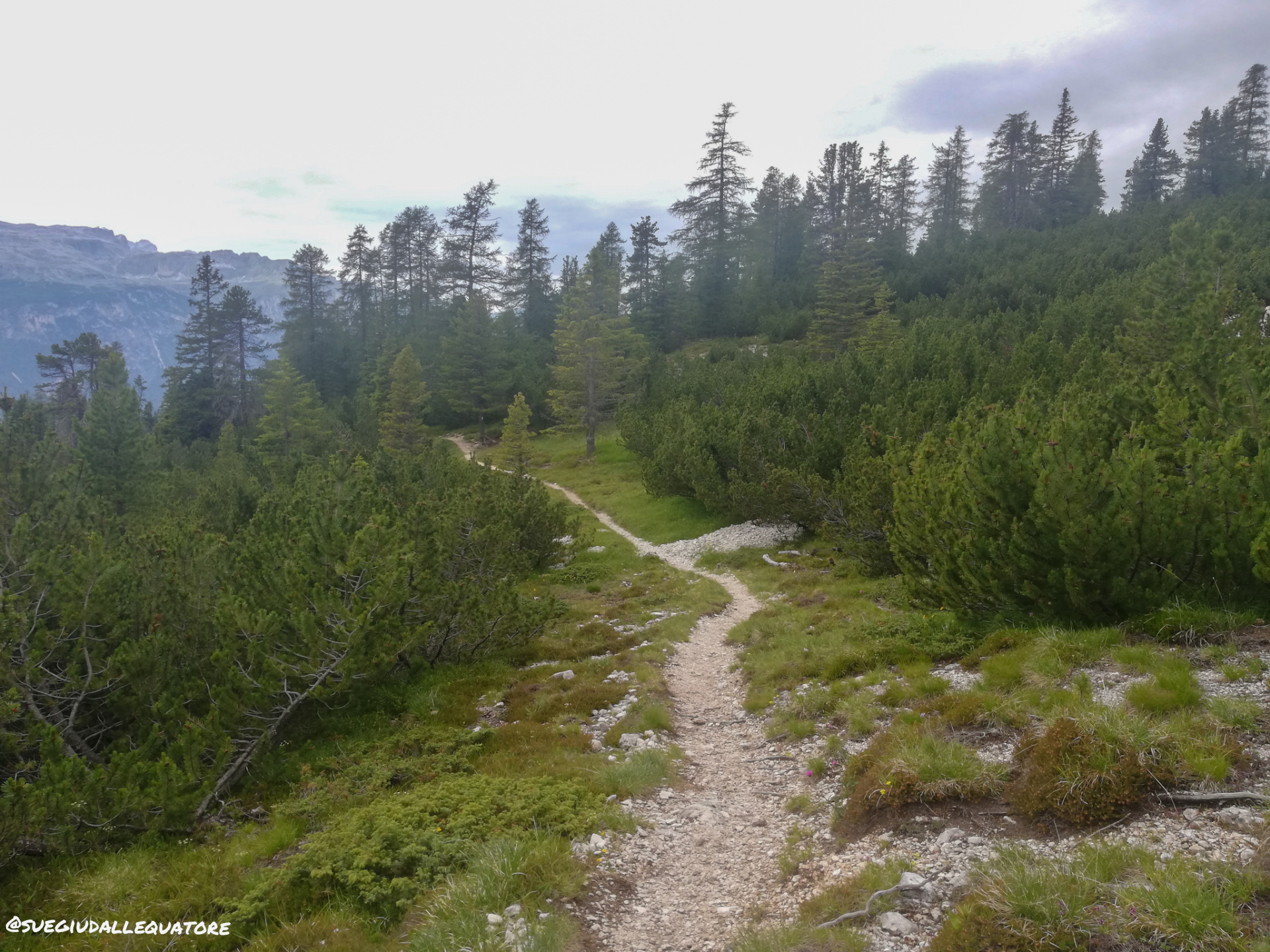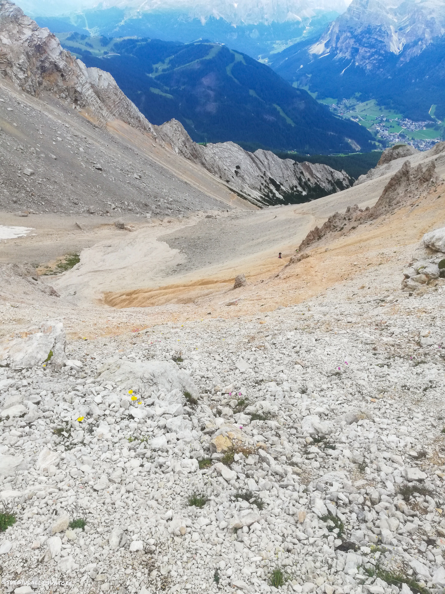 Dopo un breve riposo (dico breve perché il ritorno è lungo), siete pronti ad affrontare la discesa ripercorrendo a ritroso il sentiero 7B fino a Ju dla Crusc. Per chi volesse accorciare il giro c’è la possibilità di riscendere da dove si è saliti ma facendo la ferrata al contrario (percorso più breve ma più difficoltoso a livello tecnico, sopratutto per la presenza di persone che salgono). Noi, invece, arrivati al bivio abbiamo proseguito per il sentiero n°7, con indicazione Forcella de Medesch Scharte.