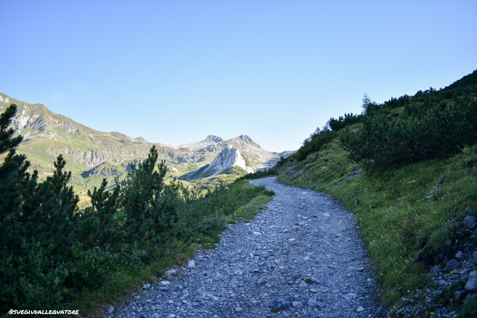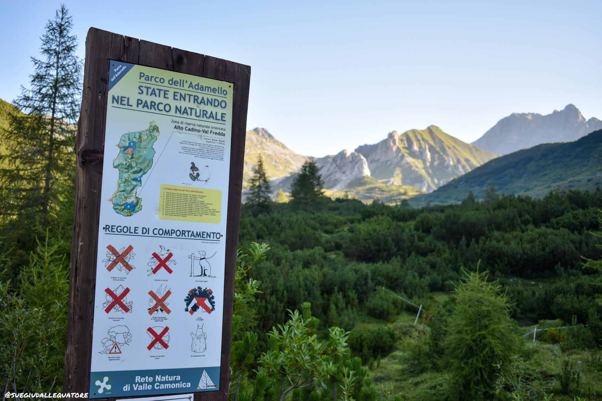 Il sentiero da seguire è il n° 419. Si trova sulla vostra destra dando le spalle al parcheggio, dalla parte opposta alla Malga. Troverete comunque la segnaletica che vi indicherà l’inizio. Iniziate a salire tra i prati seguendo la ben delimitata mulattiera. Continuate fino a trovare il cartello che indica l’ingresso al Parco Naturale dell’Adamello. Godetevi i panorami di questa bellissima valle e ammiratene la flora, tra cui troverete anche le bellissime Stelle Alpine.