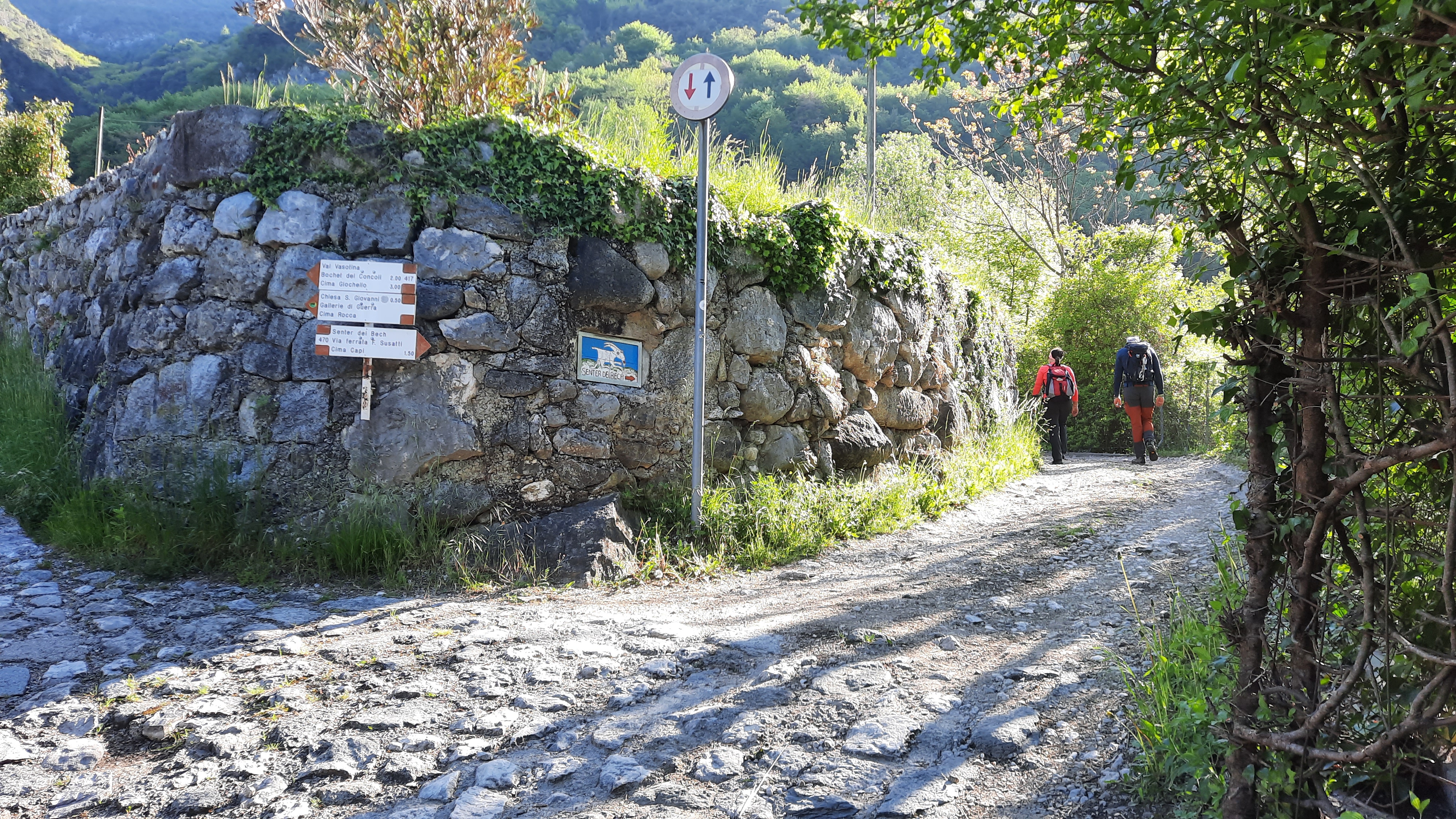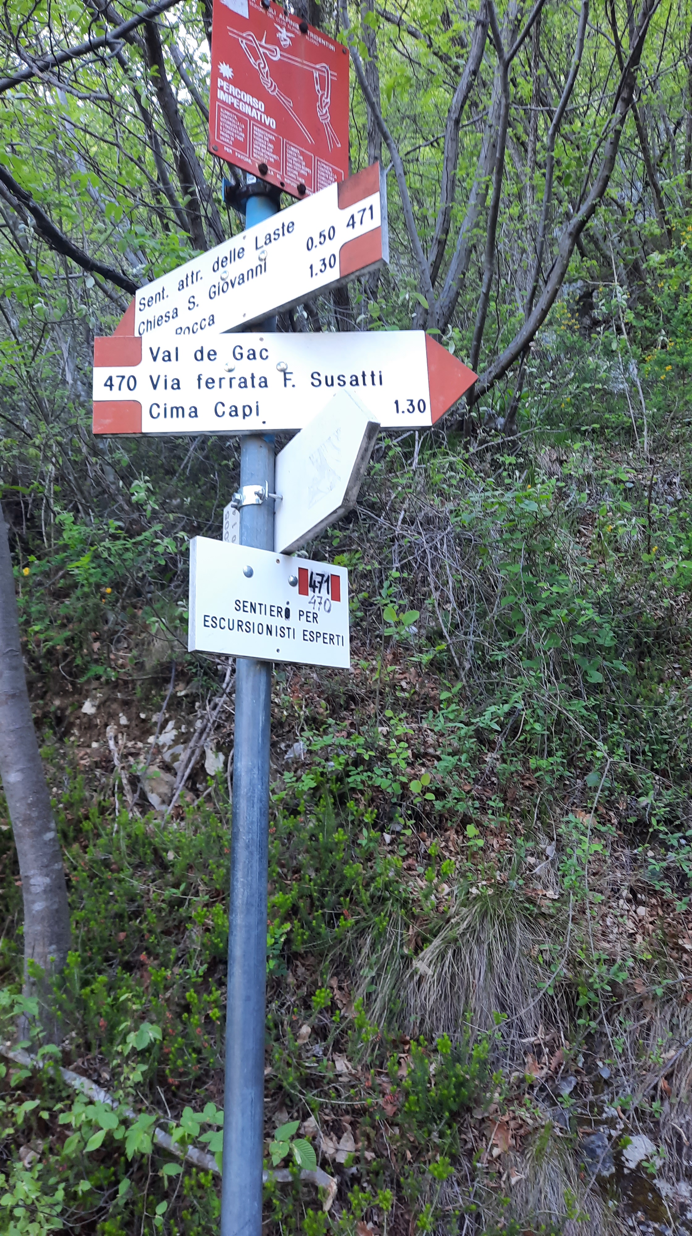 L’inizio del sentiero è facile da trovare. Lasciato alle spalle il campo da calcio troverete la segnaletica che vi indicherà varie destinazioni tra cui la nostra meta, Cima Capi. Una volta svoltato a destra seguite la strada asfaltata tra le case e continuate fino ad arrivare ad una mulattiera che vi porterà ad un bivio.