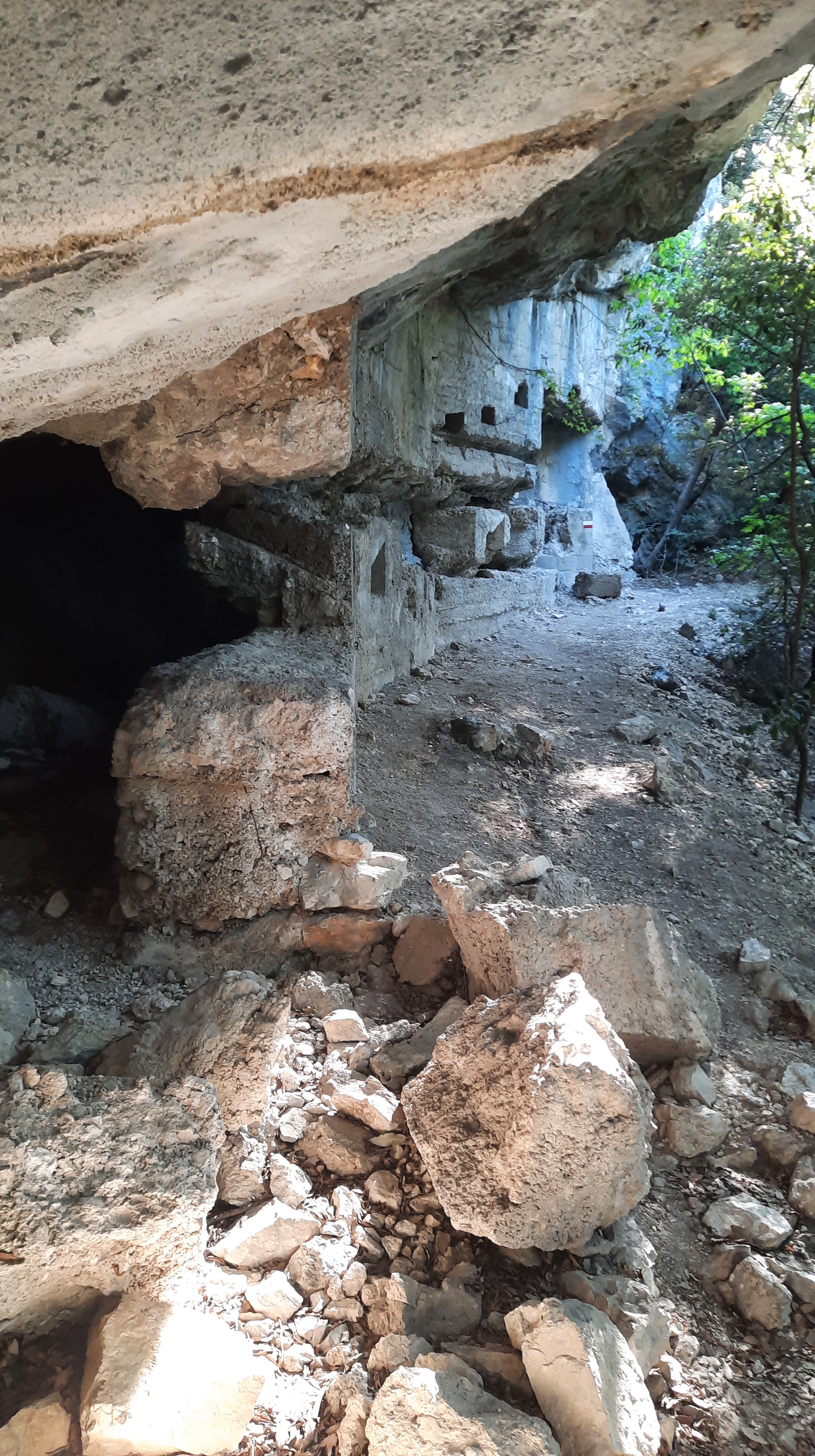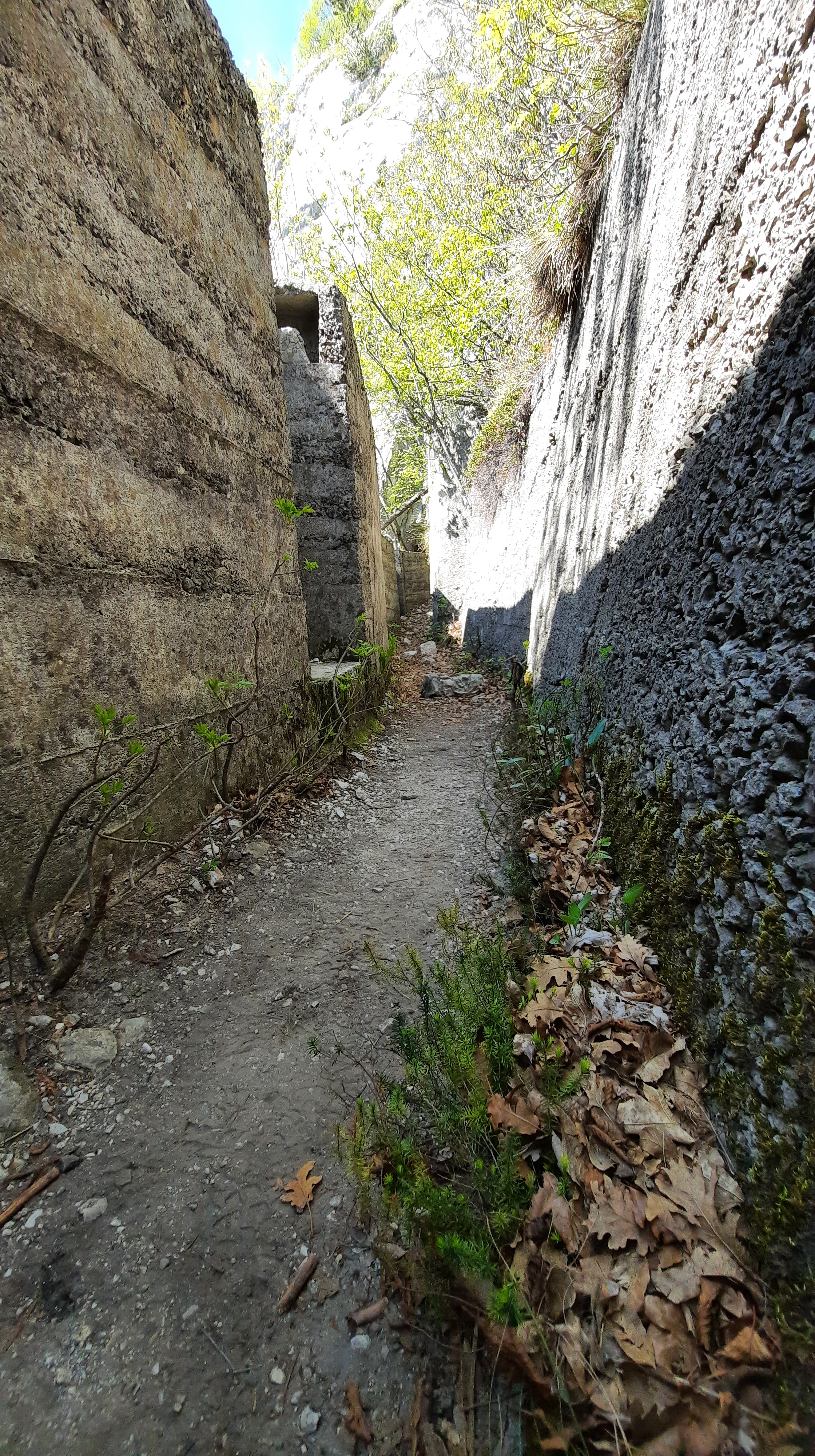 Una volta riposati è il momento di scendere. Troverete subito la segnaletica che indica Biacesa e ferrata Foletti tramite sentiero n° 460. Fate attenzione al primissimo tratto di discesa, vista la mancanza di cordini metallici. Proseguite, superate altre fortificazioni passandoci attraverso e prendete il sentiero che gira verso sinistra (fate attenzione a non seguire alcune tracce di sentiero sulla destra perché non portano da nessuna parte).