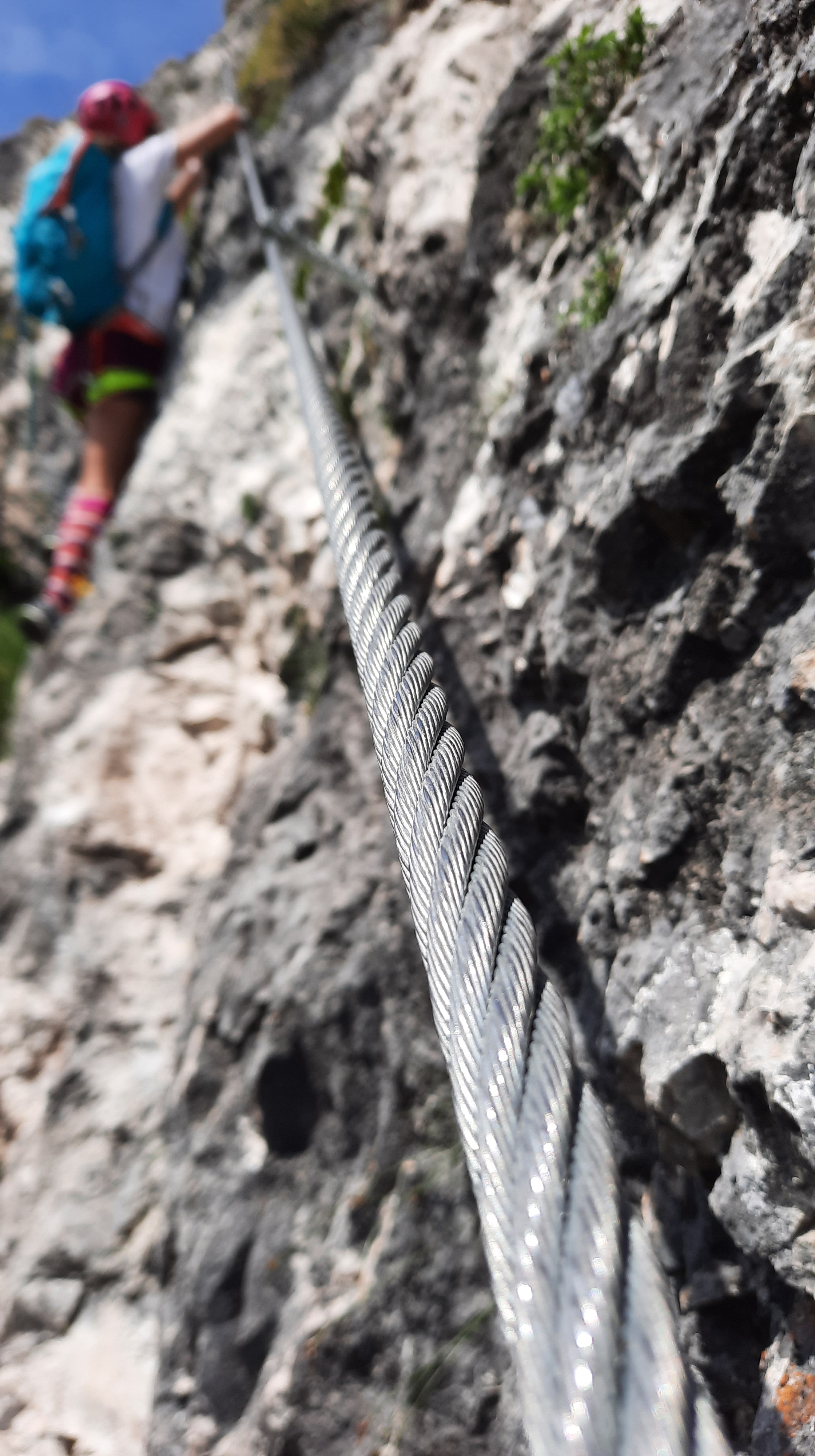 La ferrata non presenta difficoltà tecniche elevate ma in alcuni punti avanza una discreta esposizione. Il primo tratto è in diagonale verso sinistra con, subito dopo, un tratto verticale su facili roccette. Qui inizia la parte più difficile della ferrata, dove bisogna superare un paio di placchette e un canalino che metterà un po’ alla prova lo scalatore. Si tratta comunque di passaggi moderatamente difficili che non dovrebbero creare problemi a chi è abituato a muoversi in ferrata.