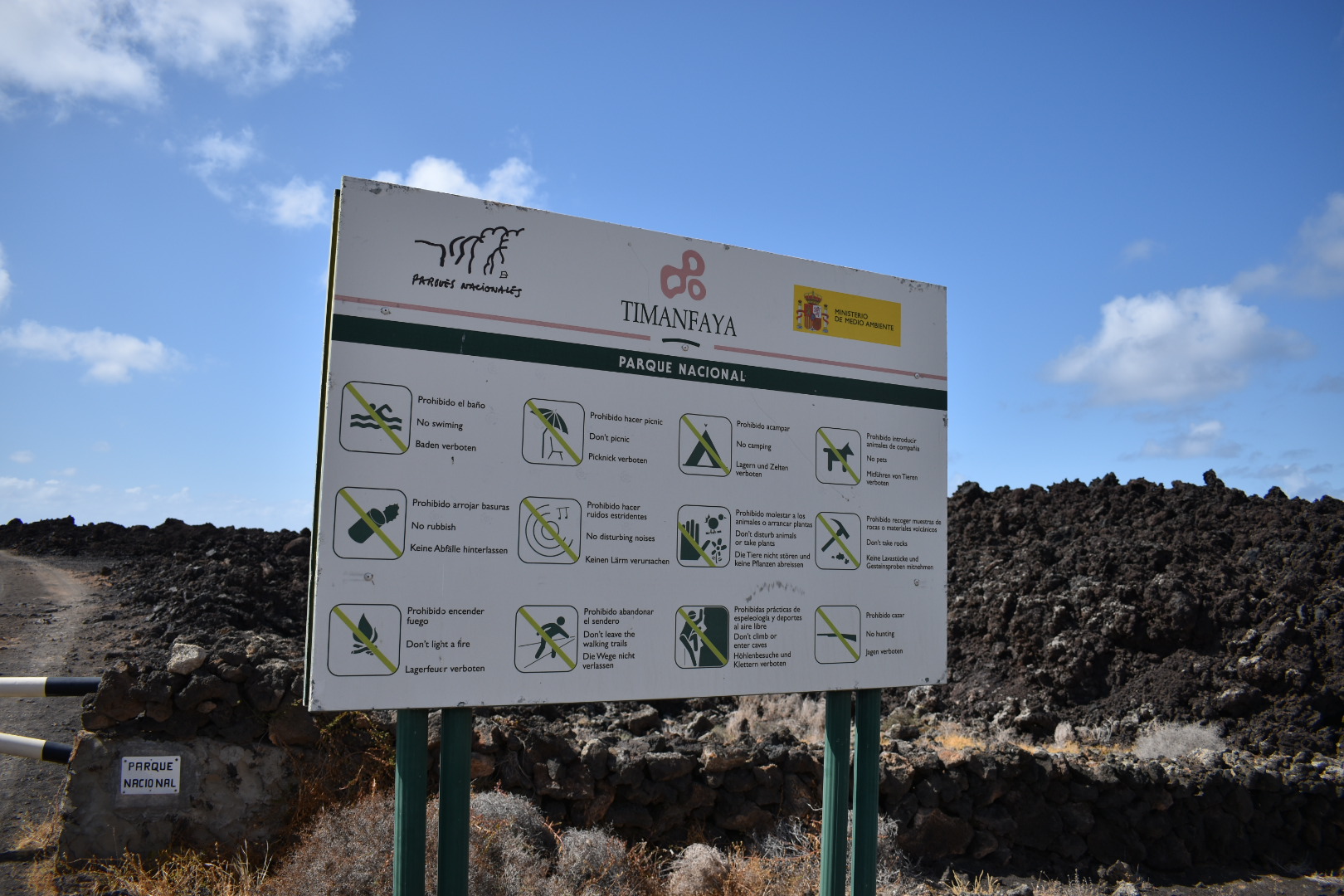 Arrivate ad una sbarra che vi indicherà l’ingresso nel Parco Nazione del Timanfaya. Si può entrare solo ed esclusivamente a piedi. Leggete bene il cartello che vi spiegherà tutti i divieti che ci sono all’interno dell’area protetta.