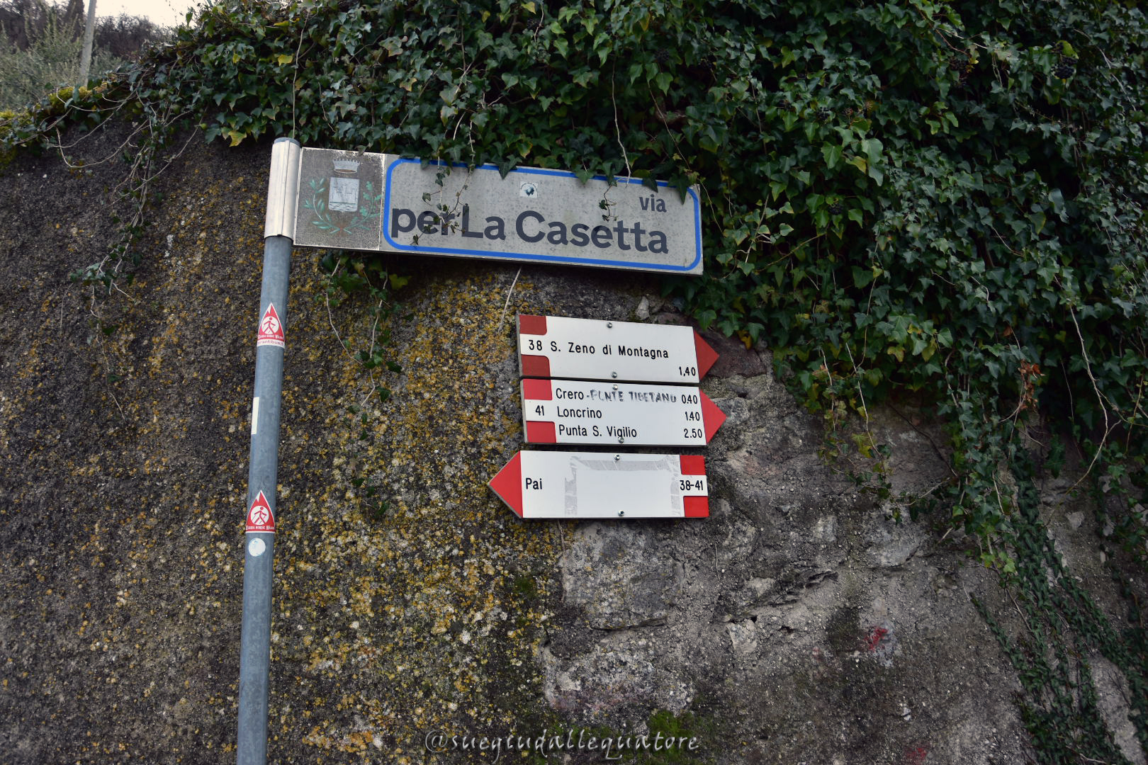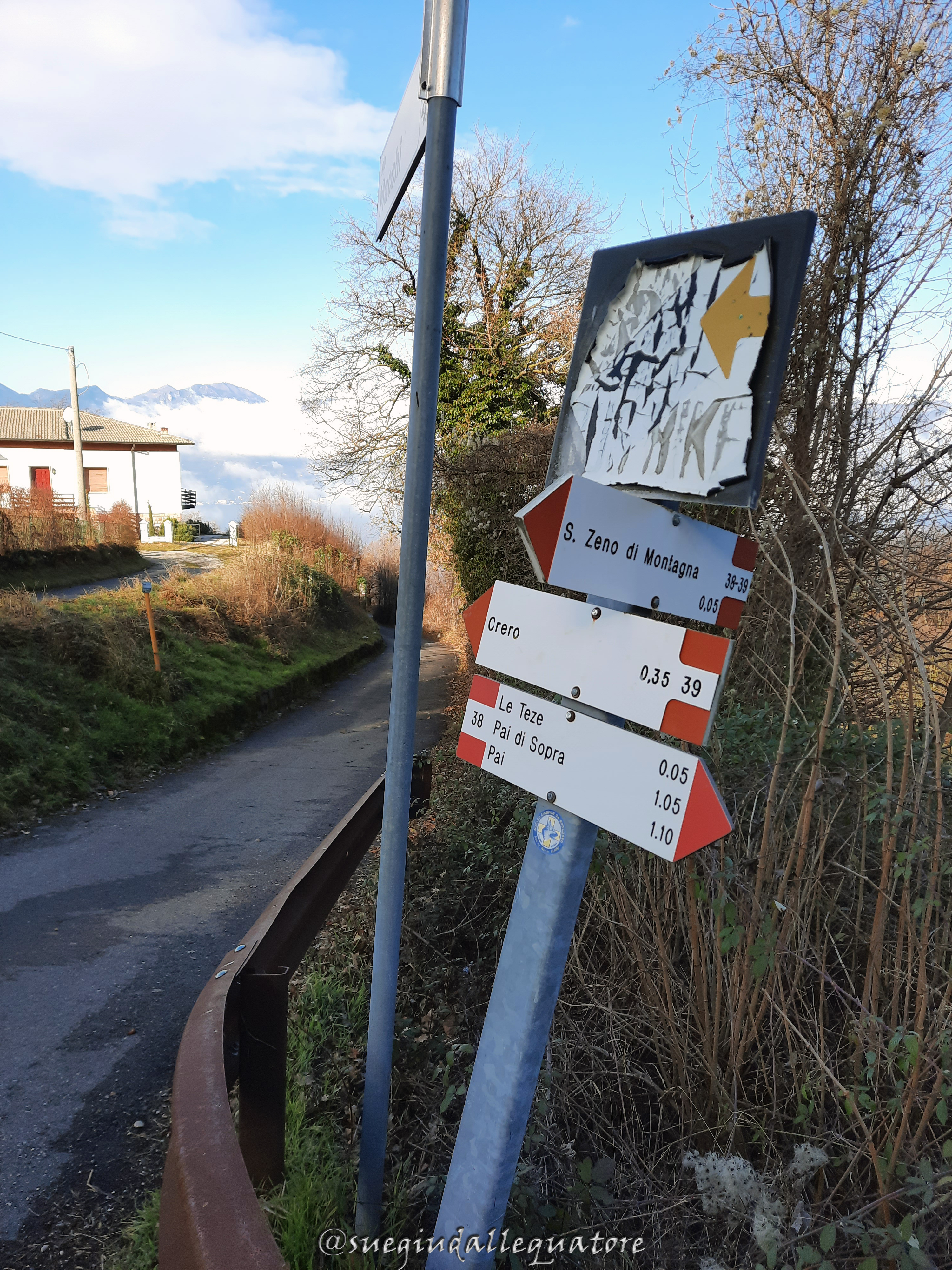 Parcheggiata l’auto dirigetevi verso nord seguendo la strada asfaltata in salita. Pochi metri dopo svoltate a destra dove la segnaletica Cai bianca e rossa indicherà San Zeno di Montagna, sentiero Cai n°38. Continuate per il primo tratto su asfalto.