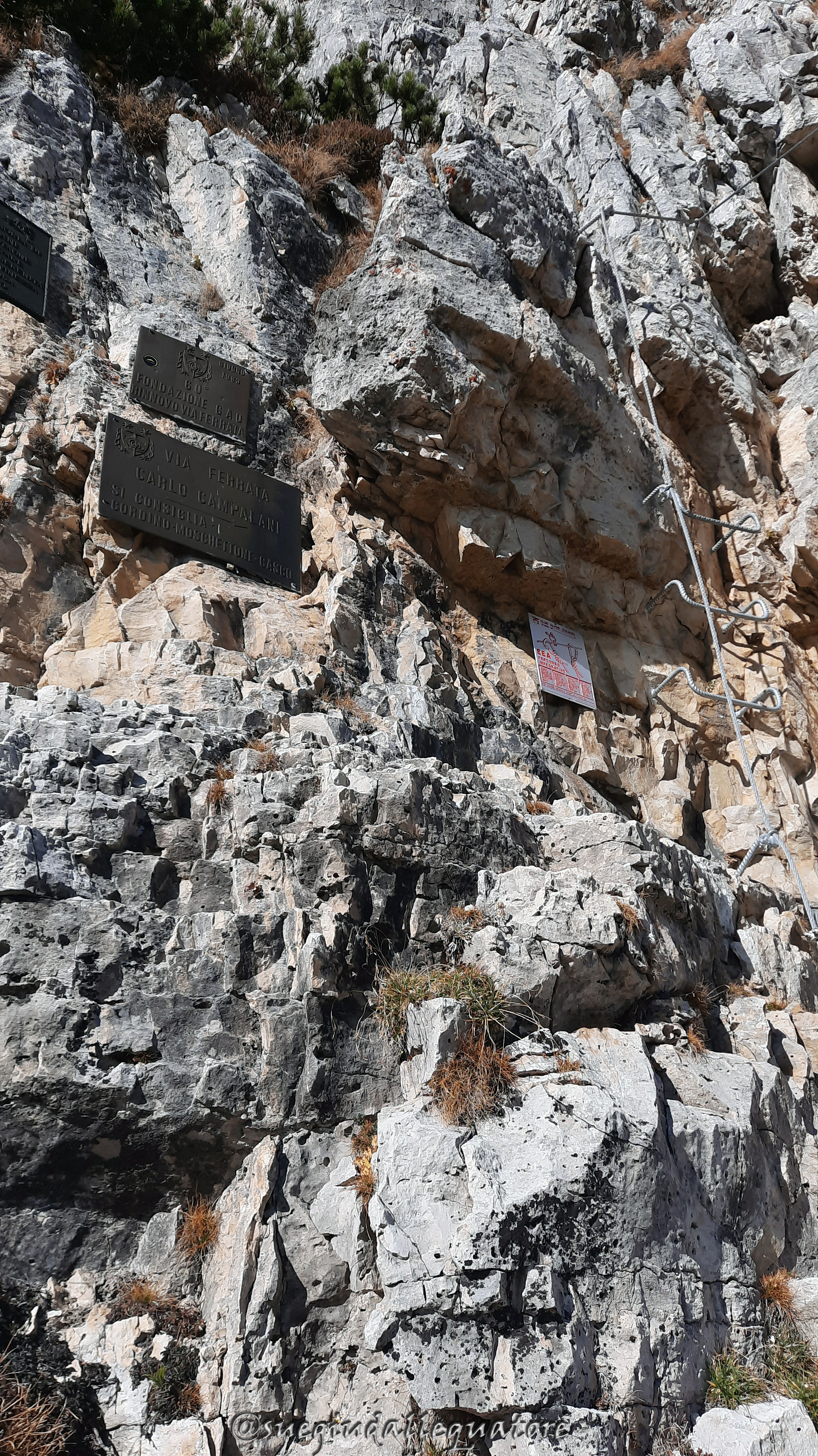 Il punto chiave e più difficile della ferrata è proprio il tratto iniziale. Delle comode cambre metalliche vi aiuteranno a superare i primi 6 metri verticali fino ad arrivare ad un comodo terrazzino. Superate uno spigolo e risalite la fessura. Dopo quest’ultima vi troverete in un tratto esposto e con pochi appigli, dal quale raggiungerete un altro terrazzino dove vi consiglio di riposarvi e riprendere fiato.