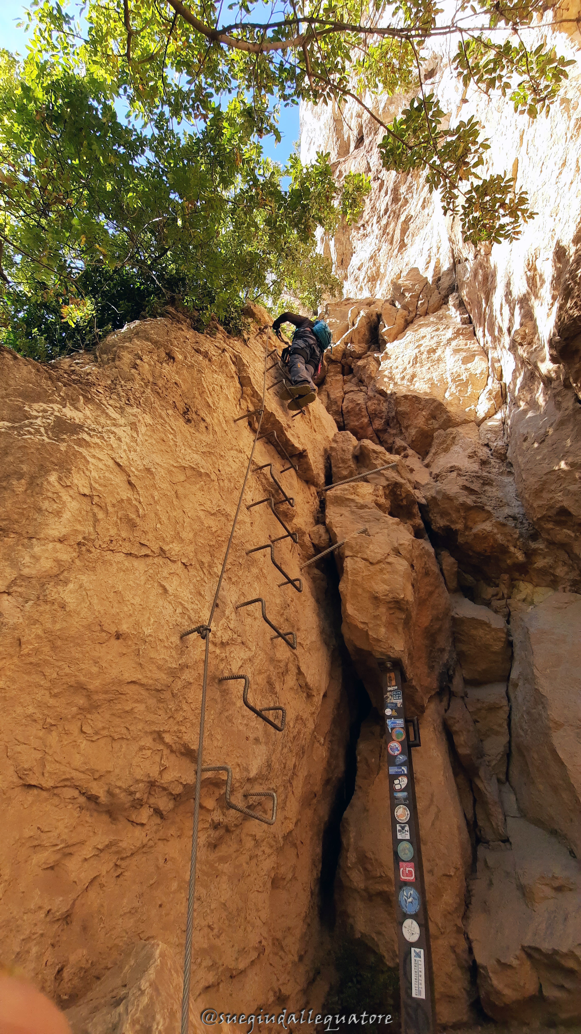 Una volta riposati dovrete affrontare due camini verticali. La salita non è tecnica, grazie all’abbondante presenza di staffe, ma è particolarmente faticosa in alcuni punti. Superati i due camini ed un tratto particolarmente aereo, aggirate lo spigolo e proseguite.