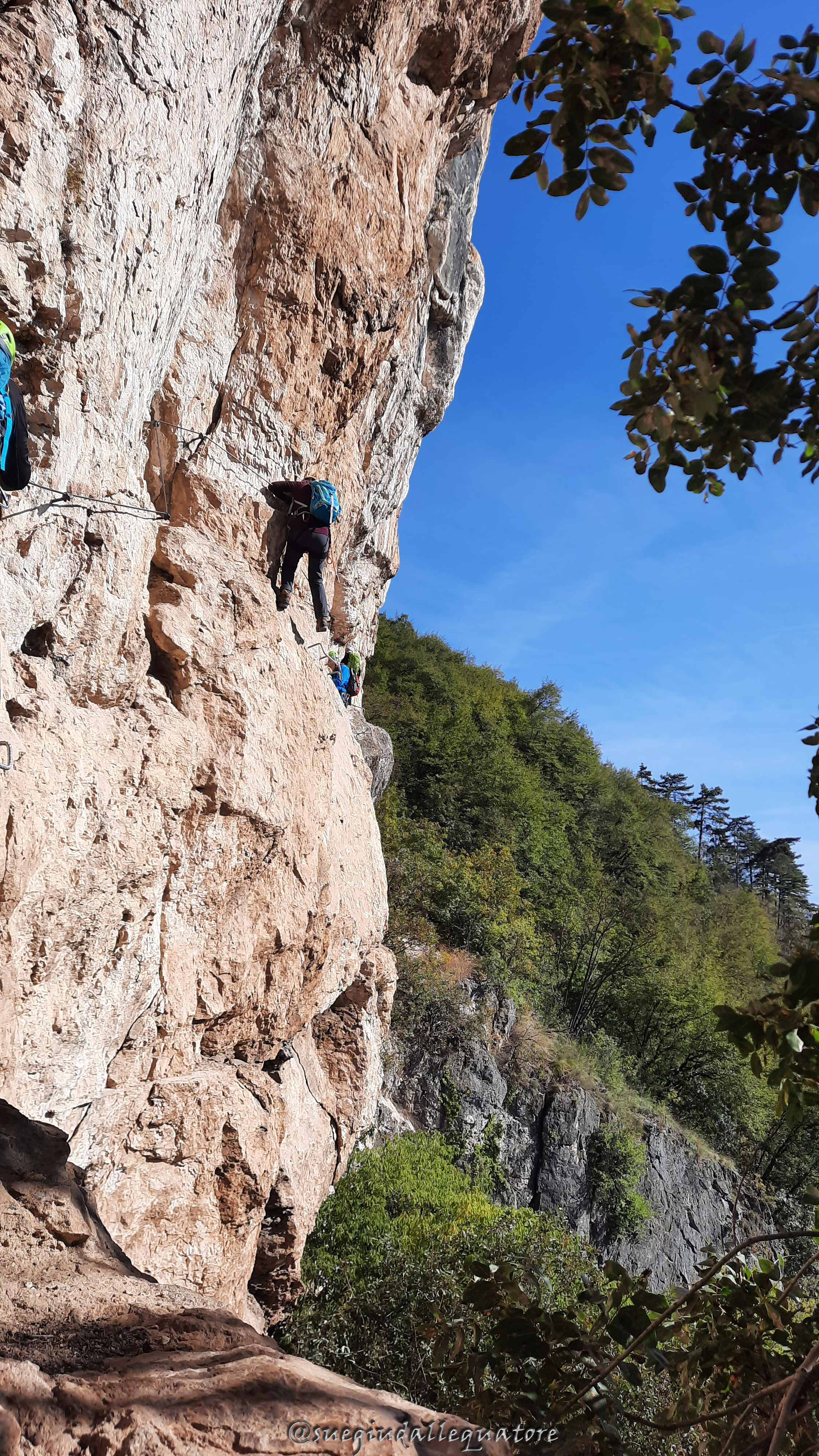 Usciti dalla parete vi troverete ad affrontare il punto più esposto della ferrata. La parete è molto liscia e “unta”. Valutate bene dove posizionare i piedi usando le cambre quando presenti. Per concludere questo tratto risalite una sporgenza e superate uno spigolo.