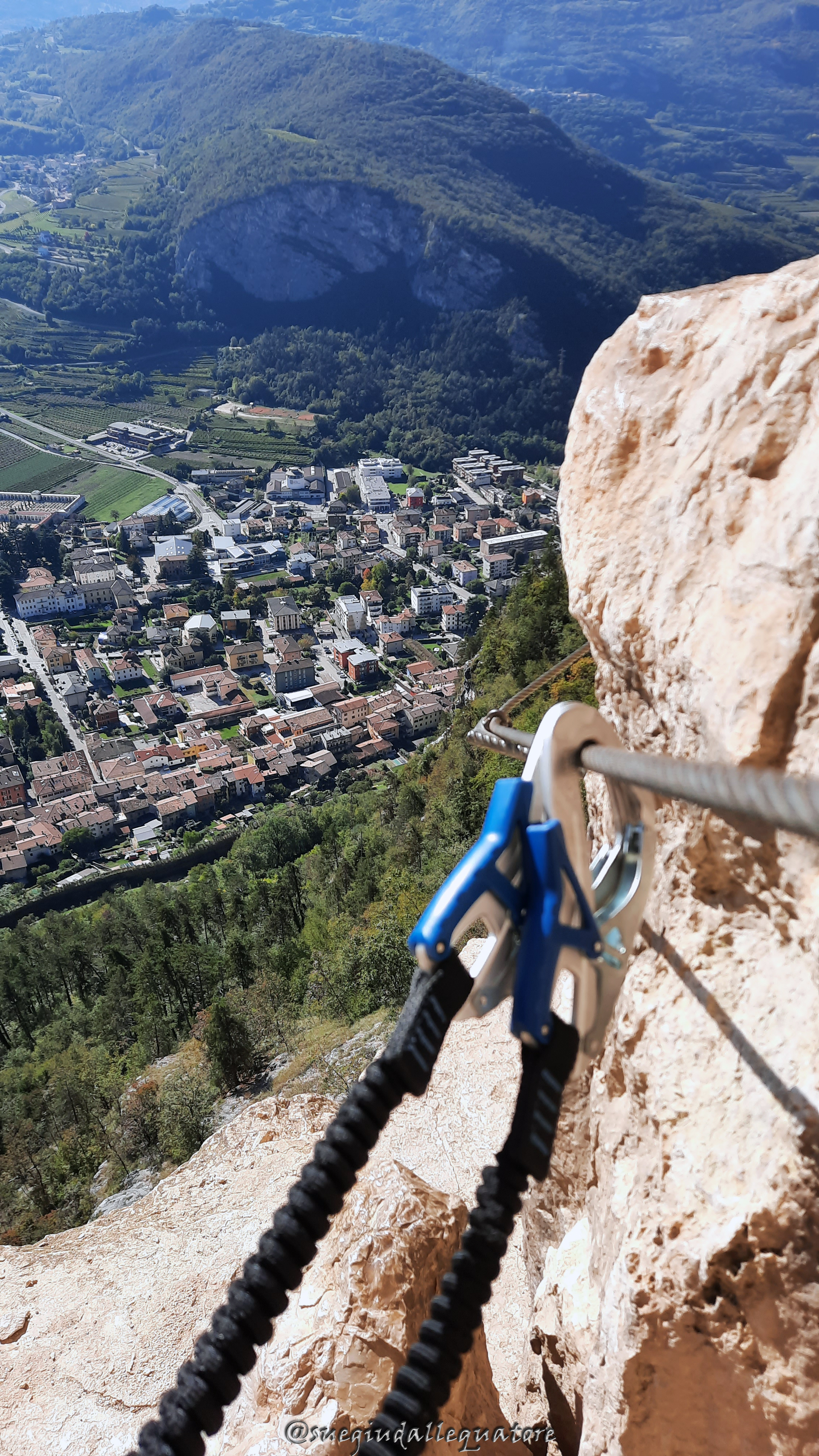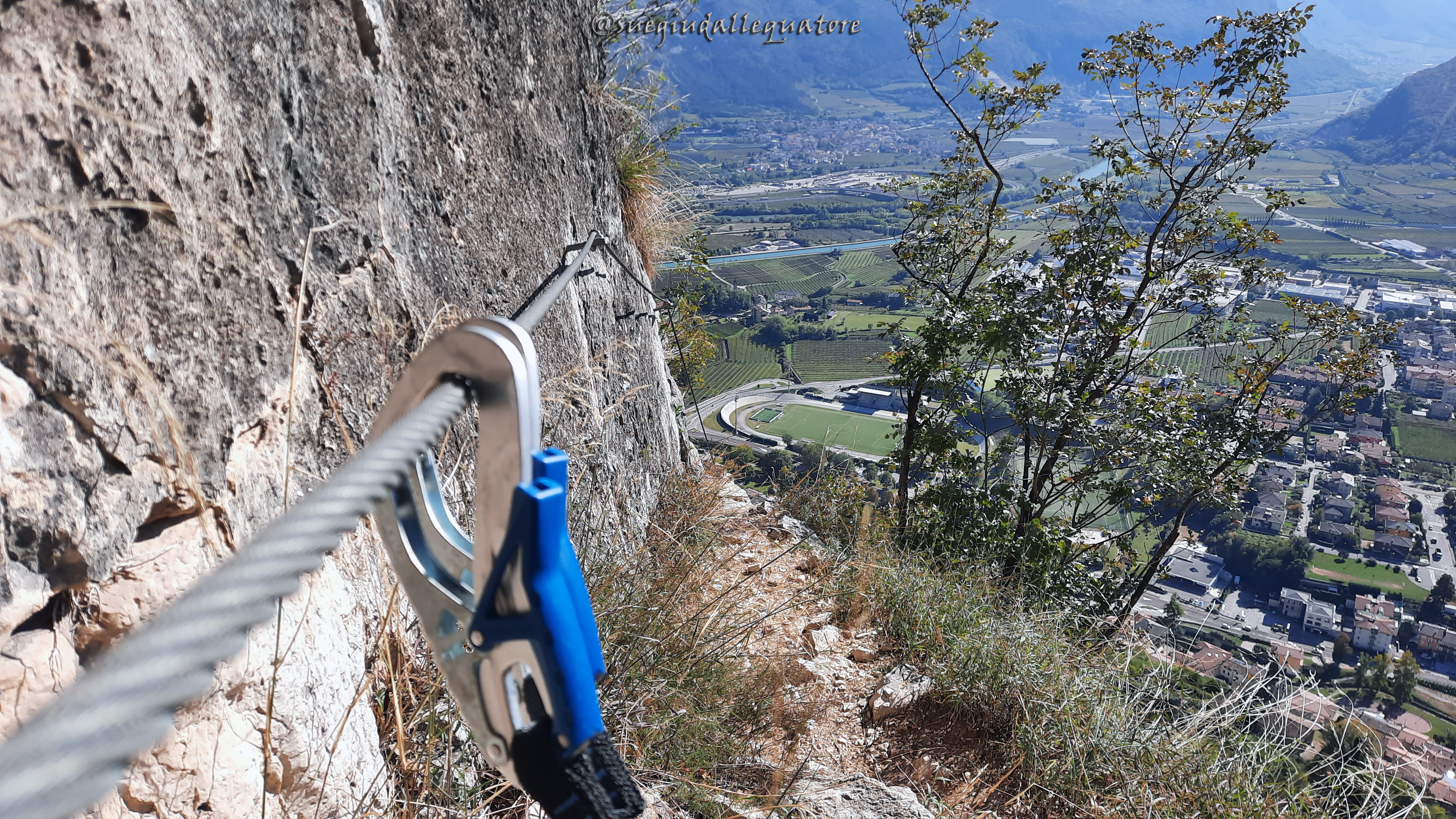 La salita, anche se non difficile tecnicamente, risulta impegnativa in questo tratto dove non è possibile fare pause. Superate un facile tratto inclinato e giungerete ad un traverso verso sinistra, che vi porterà al passaggio più aereo della ferrata. Si tratta di uno spigolo molto esposto che passa sopra l’inizio della ferrata, facilmente superabile grazie alle staffe metalliche.