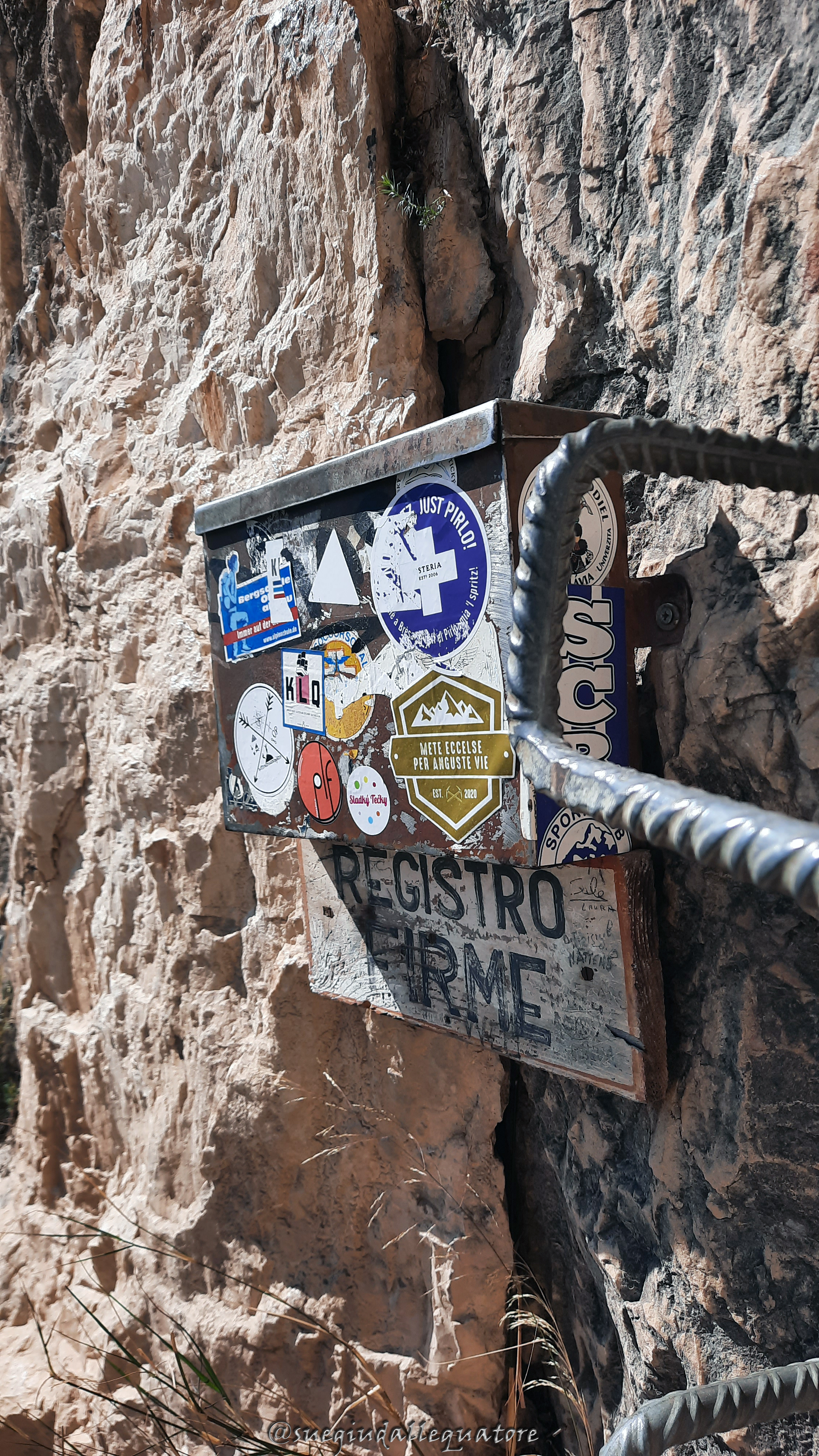 Superate la cengia verticalmente, superate l’ennesimo spigolo e salite di alcuni metri verso sinistra fino ad arrivare alla cassetta con all’interno il libro delle firme. Sulla vostra sinistra avrete un’altra salita verticale di difficoltà moderata visto che in alcuni casi spancia in fuori. Superata un altro tratto strapiombante fino ad arrivare all’ultima parete da affrontare.