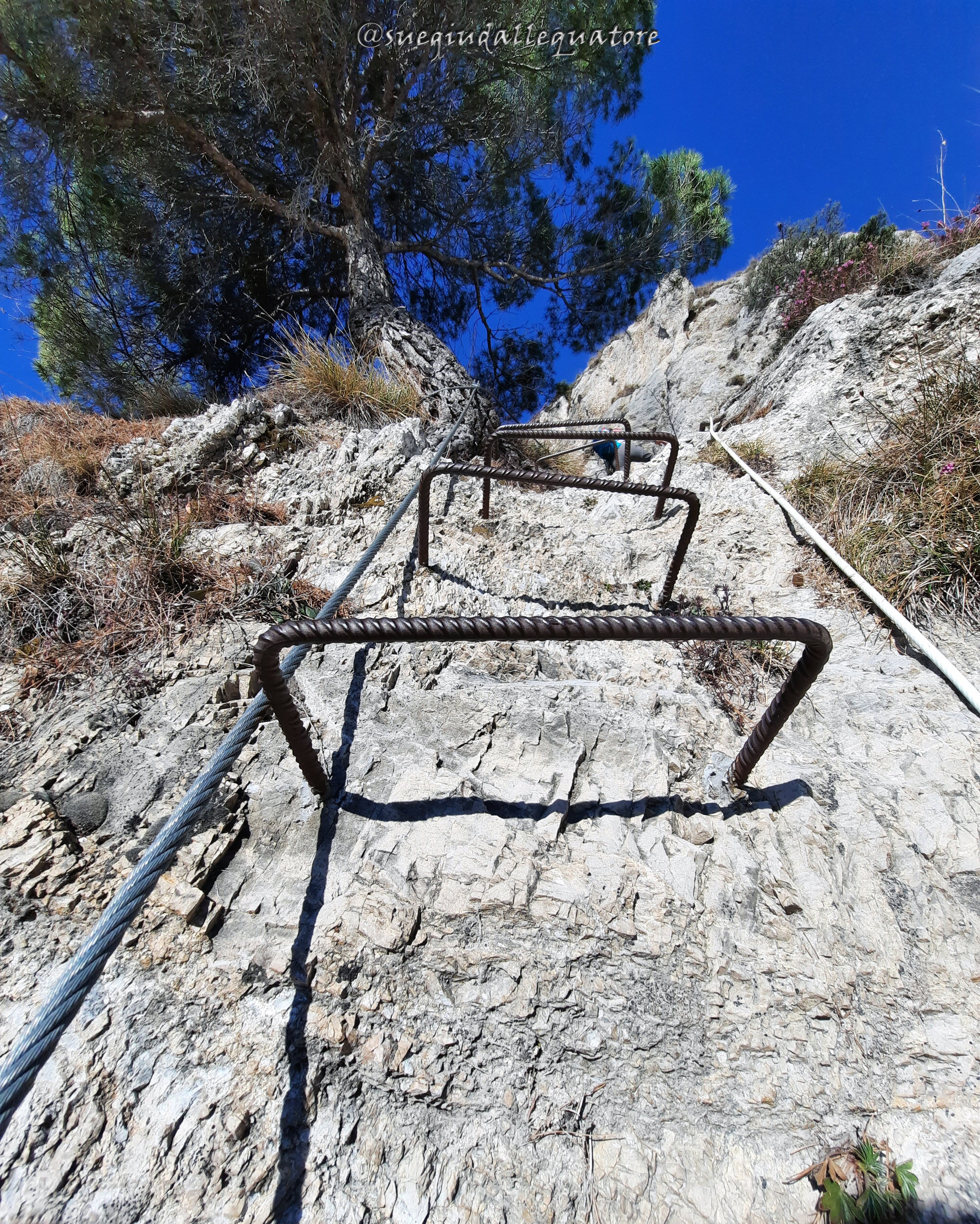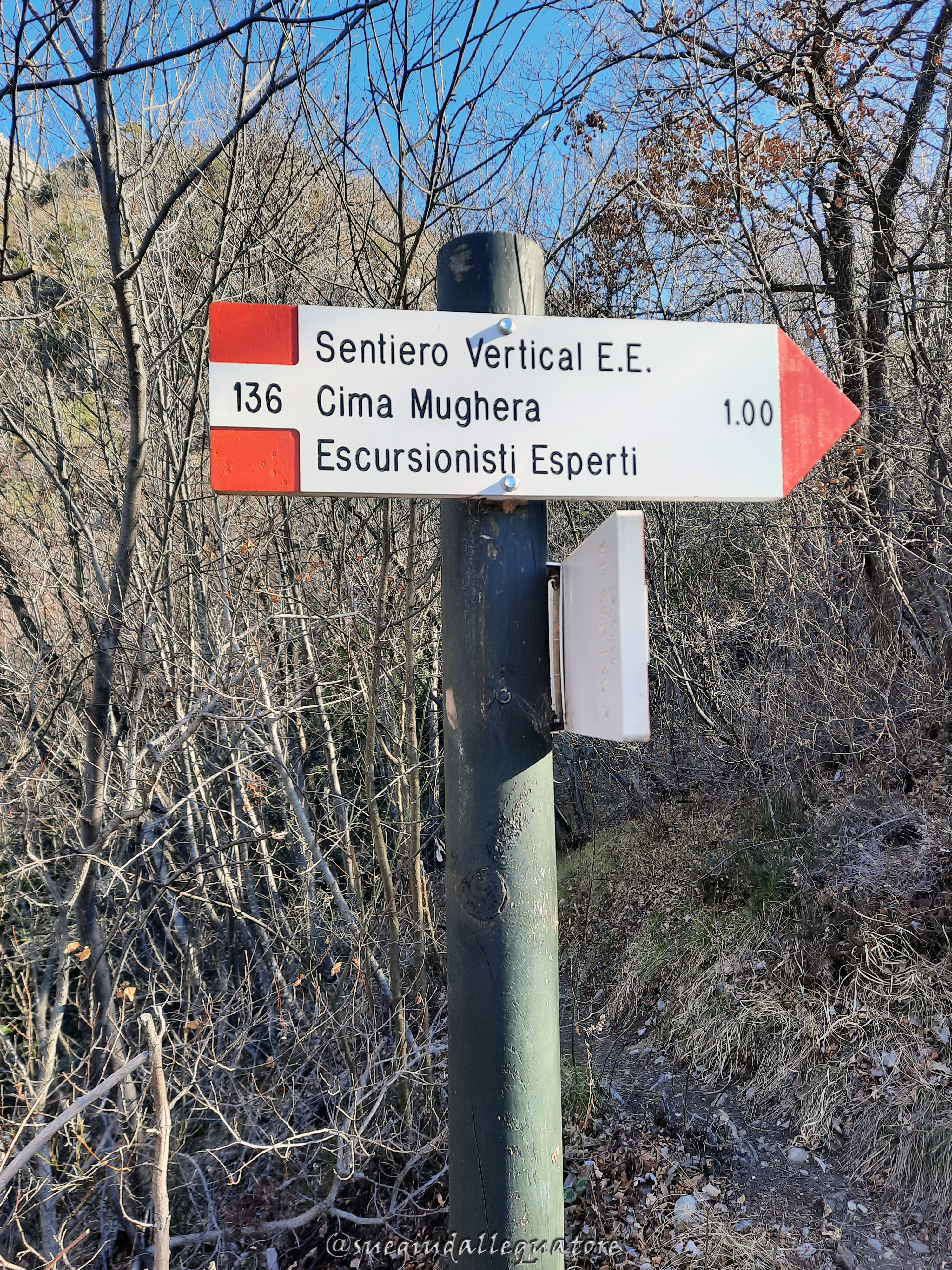 Da qui il sentiero si fa duro, alternando tratti di sentiero a tratti attrezzati, dove dei cordini metallici vi aiuteranno nella progressione. Continuate fino al bivio dove il sentiero 136 prenderà il nome di sentiero Vertical EE. Seguire le indicazioni e proseguite. Il tempo da qui a Cima Mughera è di circa 1 ora.