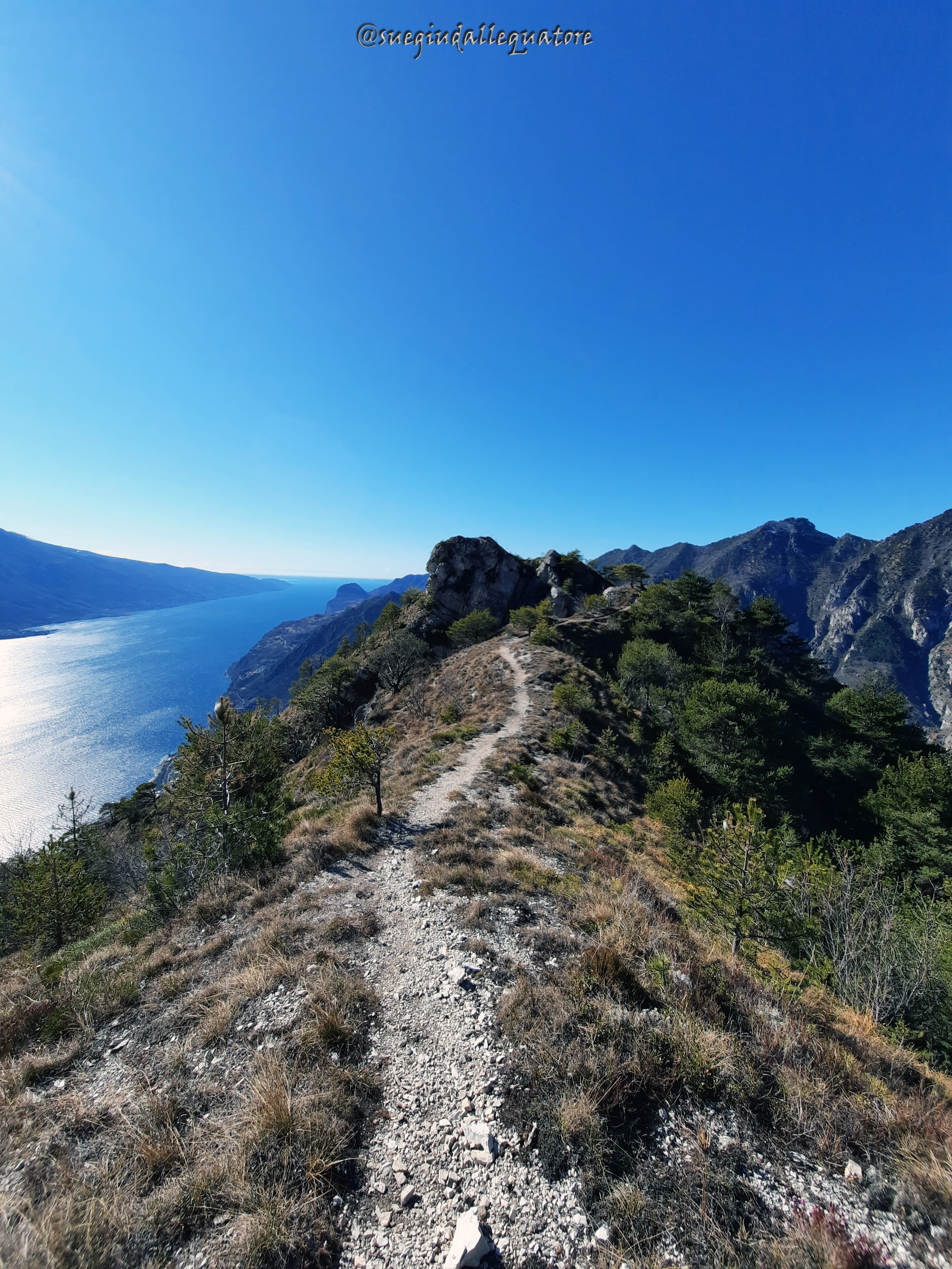 Questo tratto di sentiero è meraviglioso, anche se la salita è sempre faticosissima! Come nei tratti precedenti alterna tratti di sentiero a tratti attrezzati, tra cui delle cambre metalliche che fungono da piccola scala. Oltre a questo vi ritroverete a camminare in cresta con il Lago di Garda e l’abitato di Limone a fare da sfondo. Sono molti i punti panoramici dove fermarvi a scattare qualche foto. Seguite il sentiero ben visibile e continuate in salita, godendovi i pochi e brevissimi tratti in piano, fino ad arrivare a Cima Mughera, a quota 1161 mt.