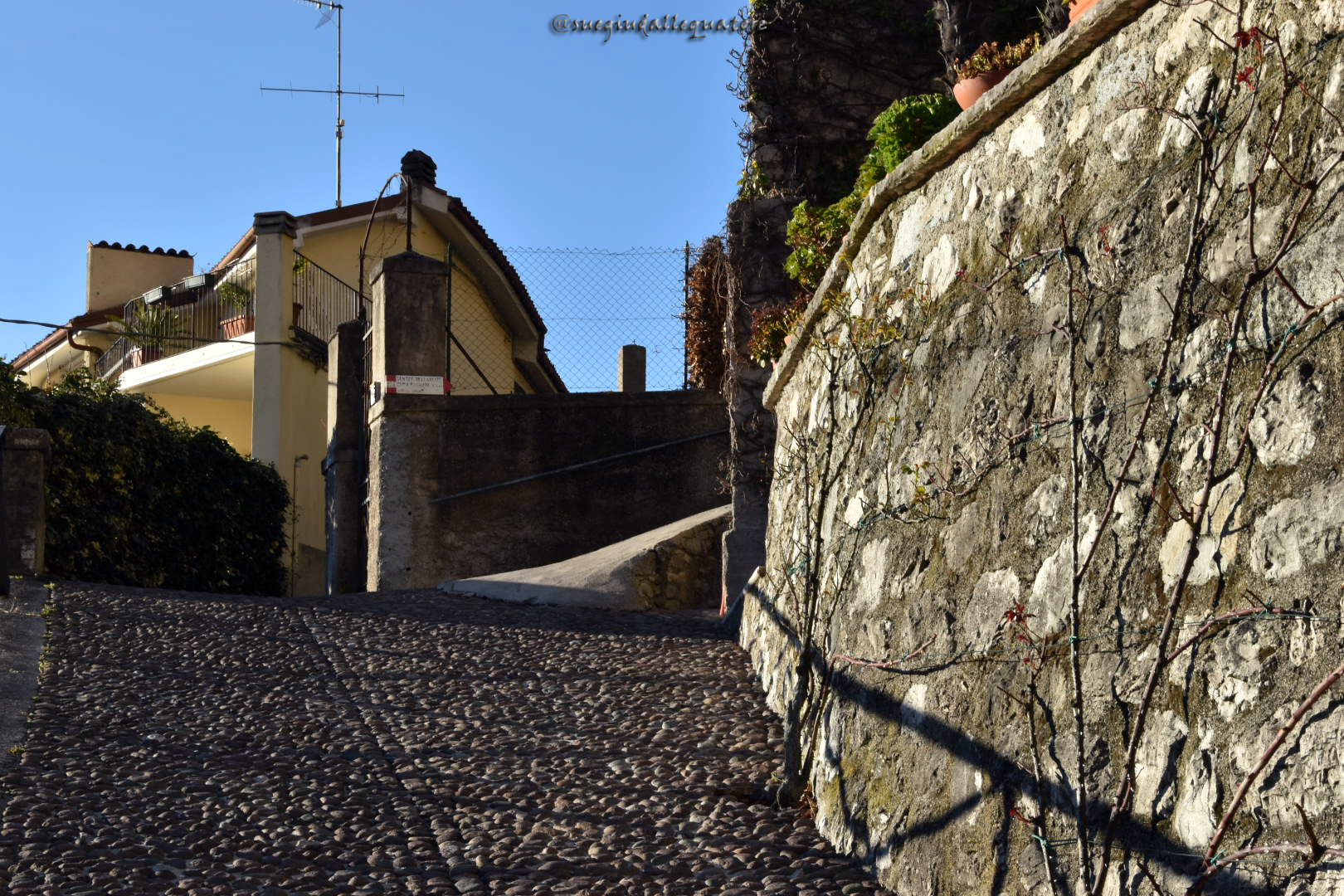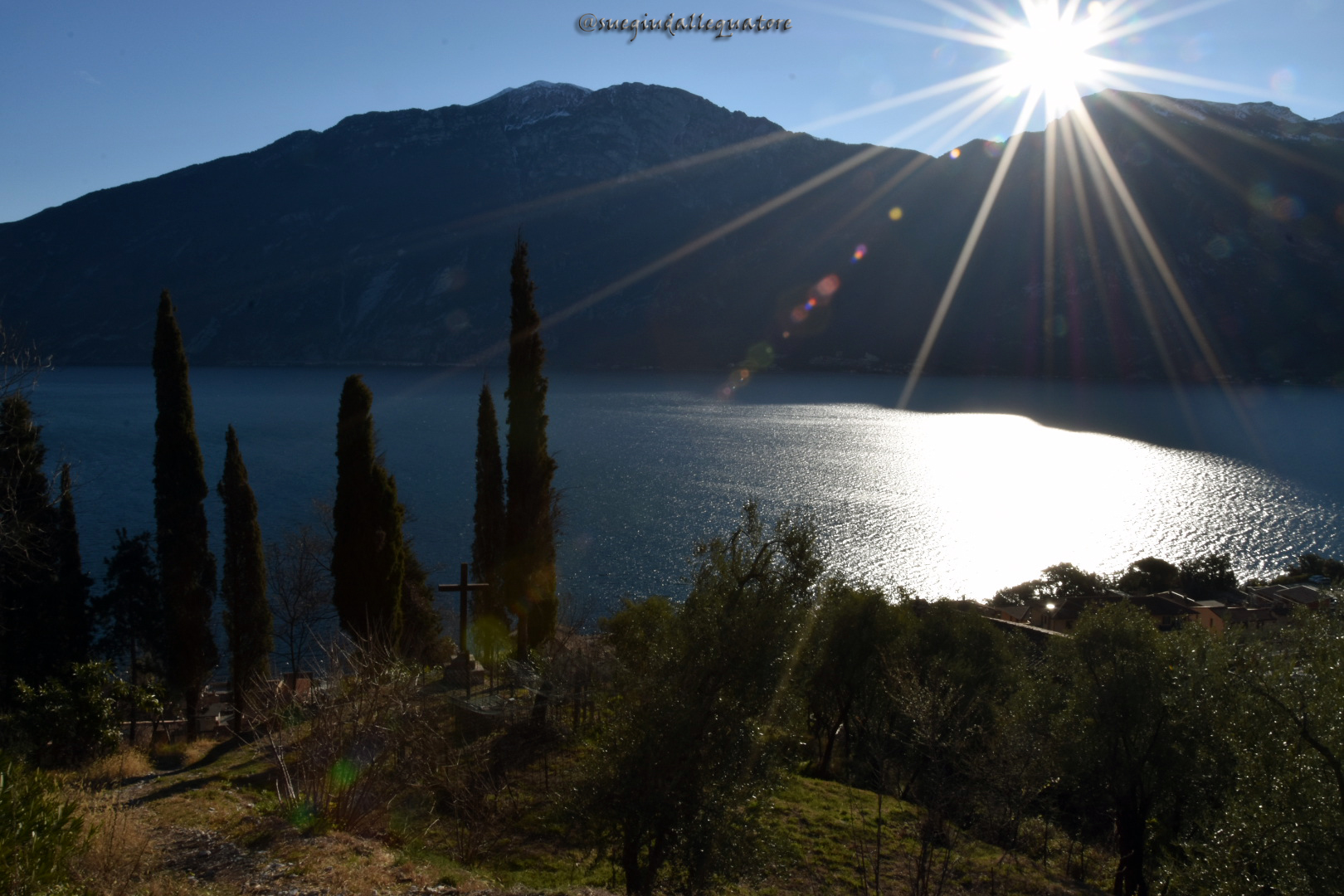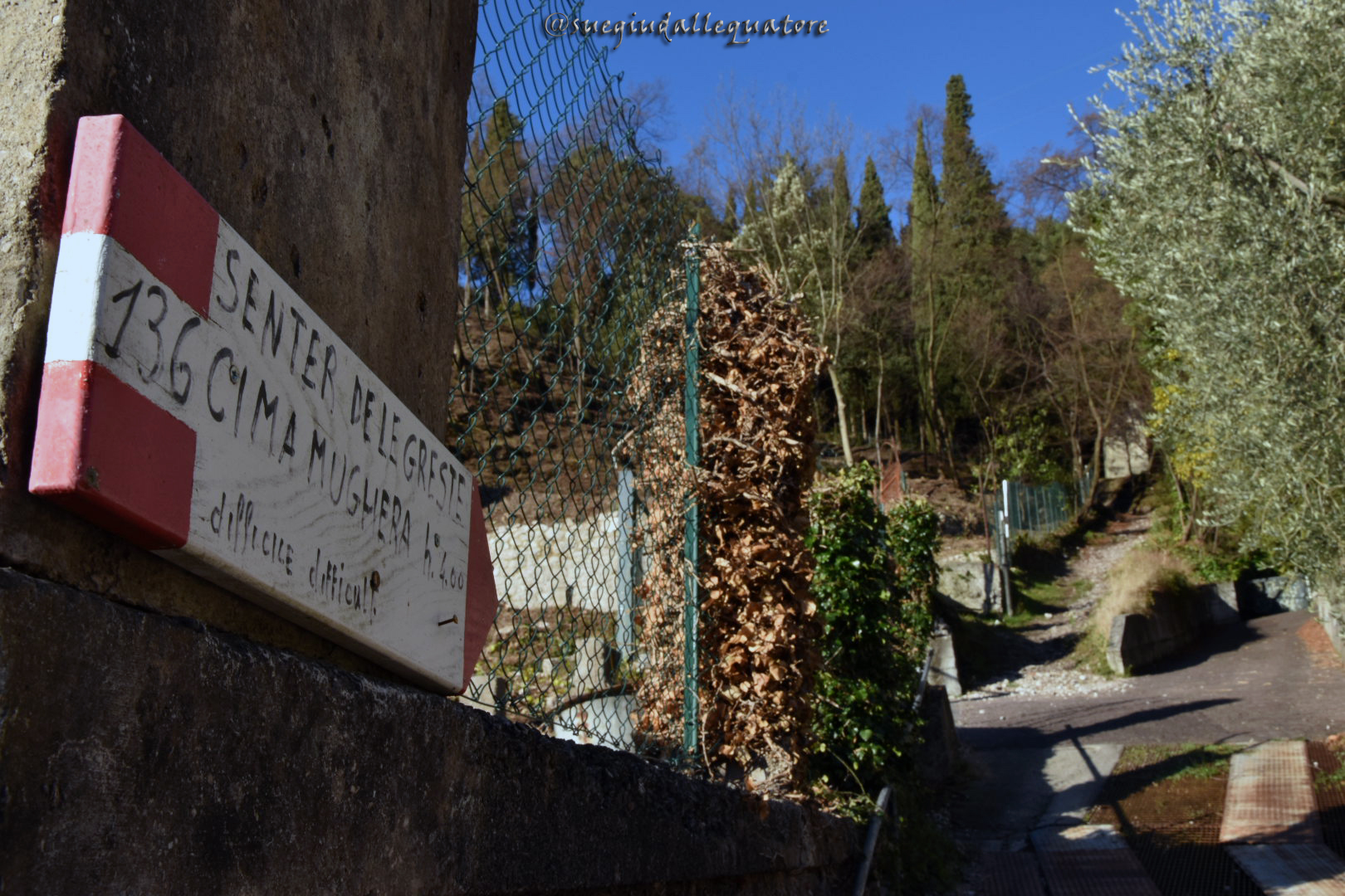 Seguite le indicazioni e iniziate a salire tramite sentiero che si inerpica sulla sinistra della strada asfaltata. La pendenza è subito notevole. Procedete fino ad arrivare ad uno spiazzo con una croce posizionata tra due cipressi, che offre un bellissimo panorama sul lago e sul sottostante abitato di Limone.