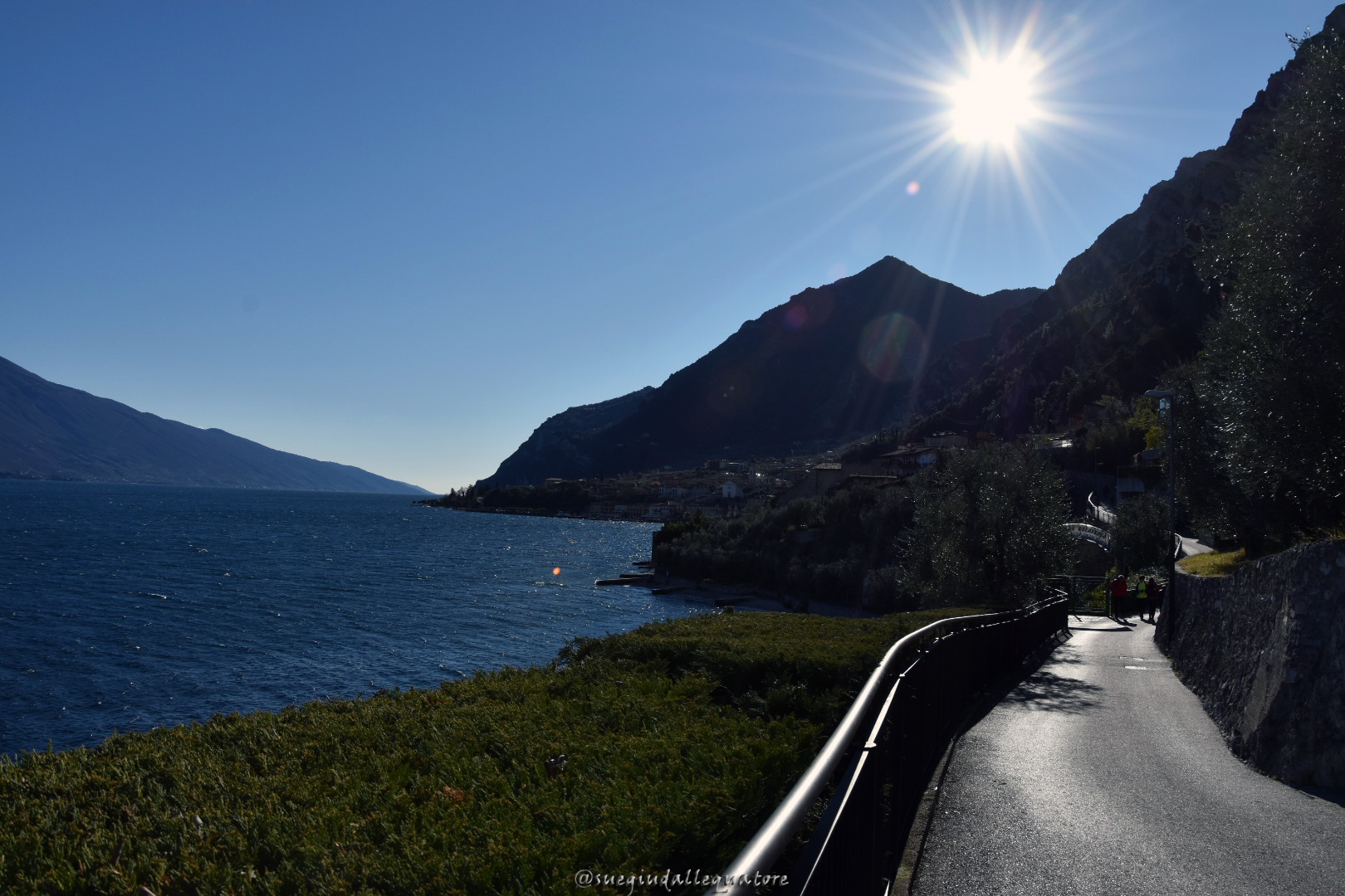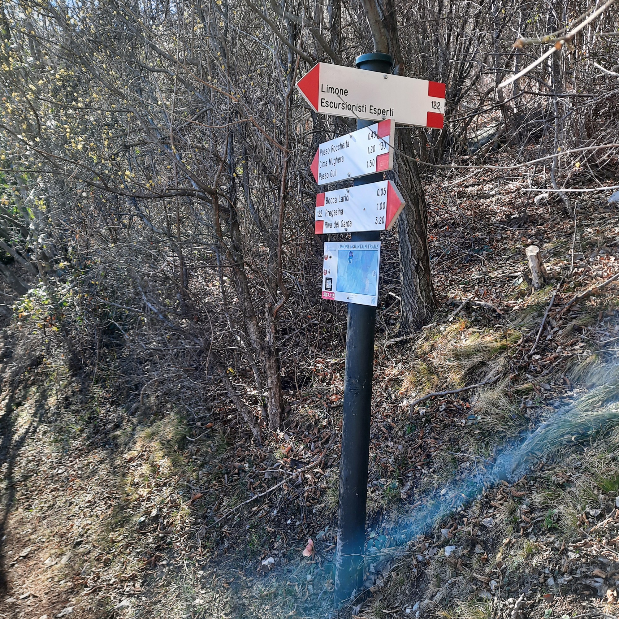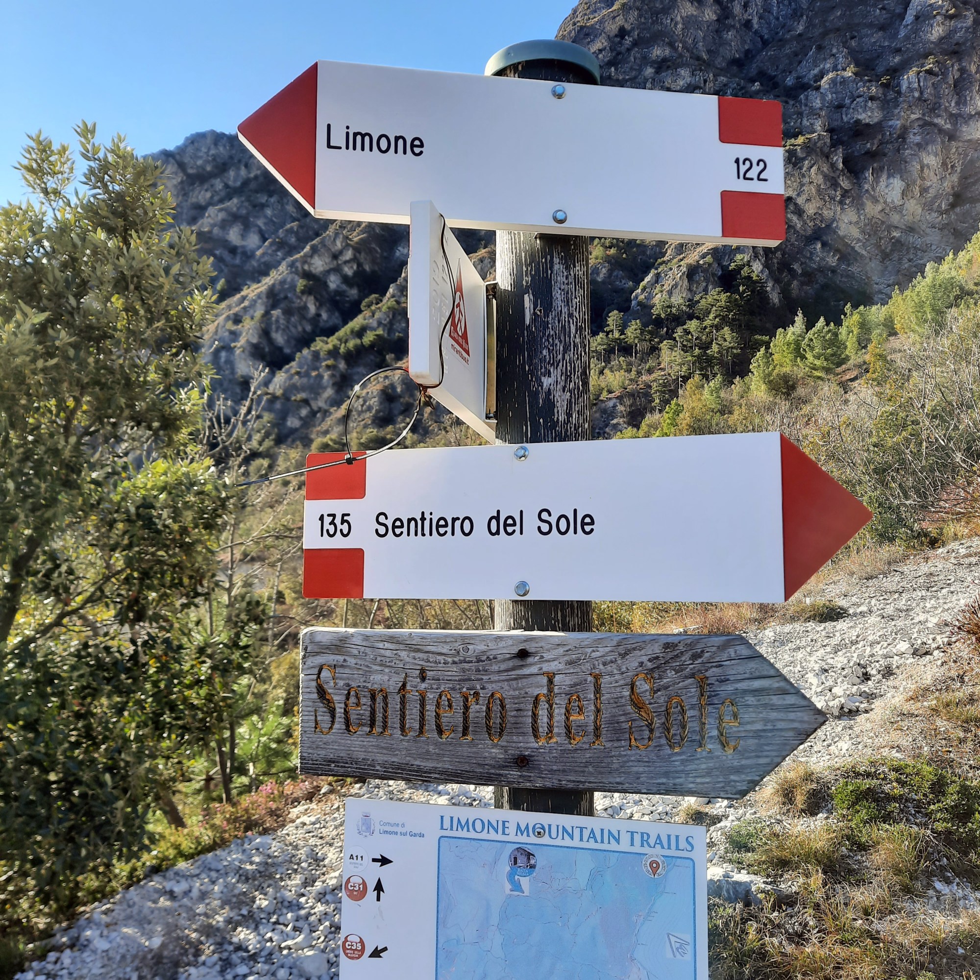Dopo un bel po’ di discesa arriverete ad un bivio con il Sentiero del Sole (numero 135) che va a sinistra. Voi continuate a seguire il numero 122 direzione Limone. Superate quest’ultimo tratto fino ad arrivare alla strada statale. Attraversatela, andando verso destra e seguendo le indicazione che indicano la ciclopedonale, che inizia all’altezza di un piccolo parcheggio, con la strada che scende verso sinistra.