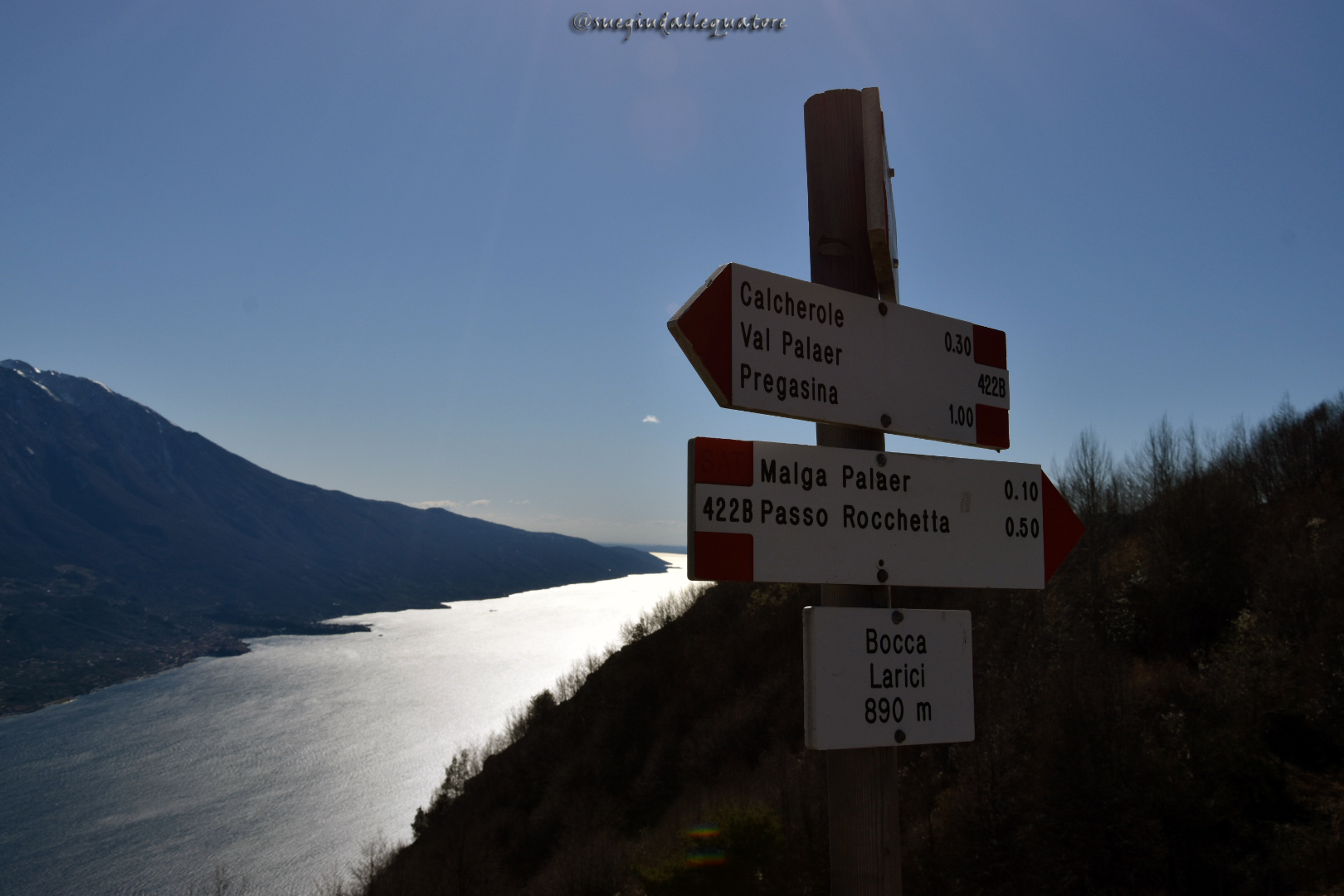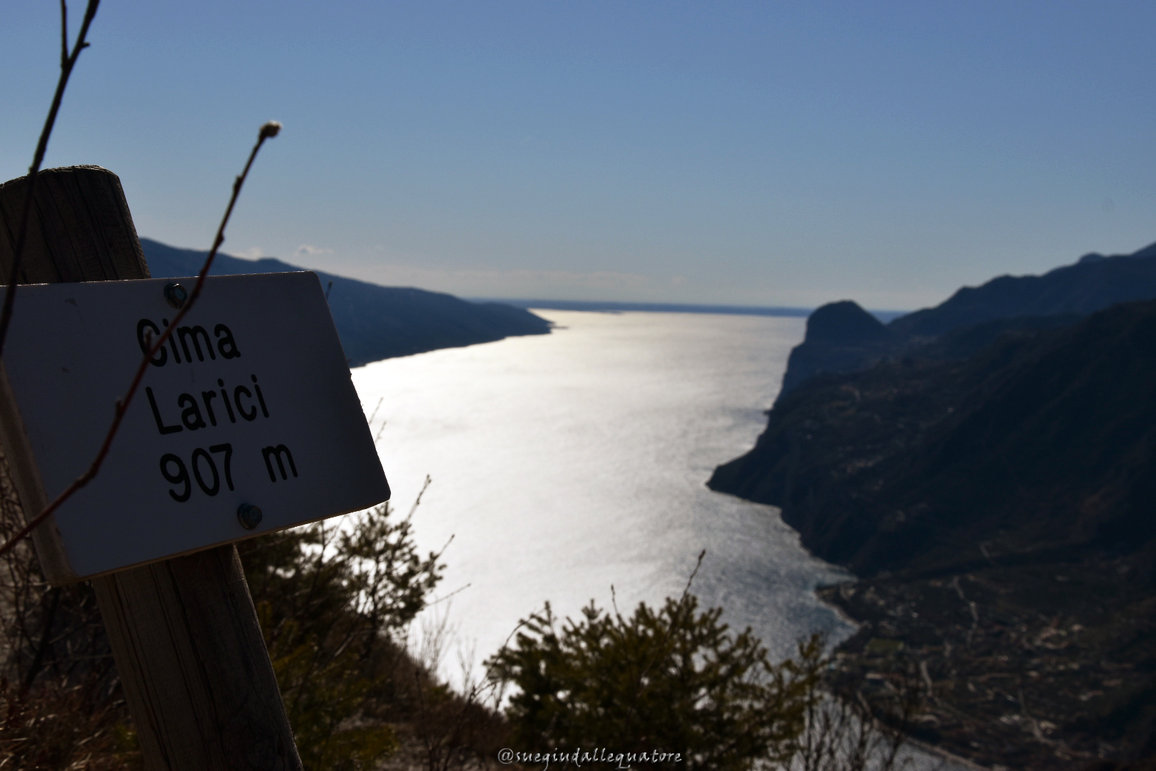 Continuate a scendere, superate il passo (dove il vento si farà sentire) e proseguite seguendo la traccia ben visibile fino a Bocca Larici (890 mt.). Seguite i cartelli che indicano Punta Larici (907 mt.) e con un po’ di salita arriverete a quello che forse è il miglior belvedere sul Lago di Garda. Godetevi lo splendido panorama e, una volta scattate le foto di rito, scendete di nuovo verso Bocca Larici.
