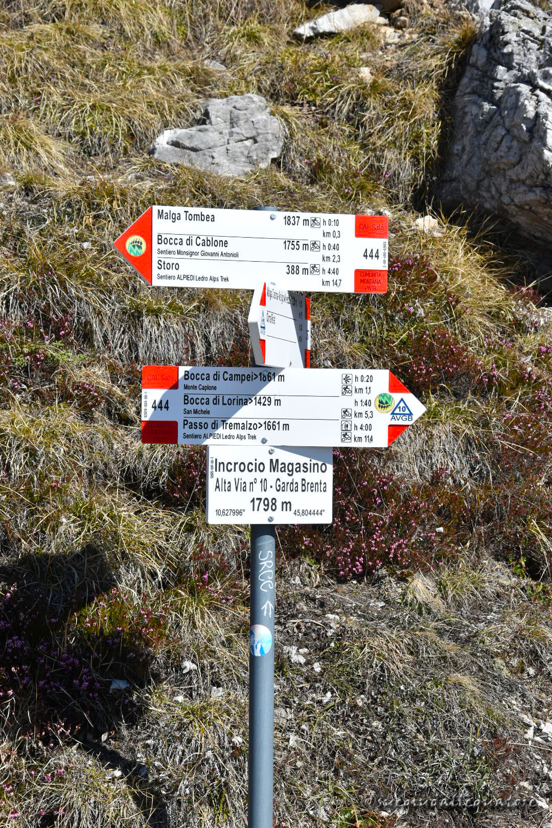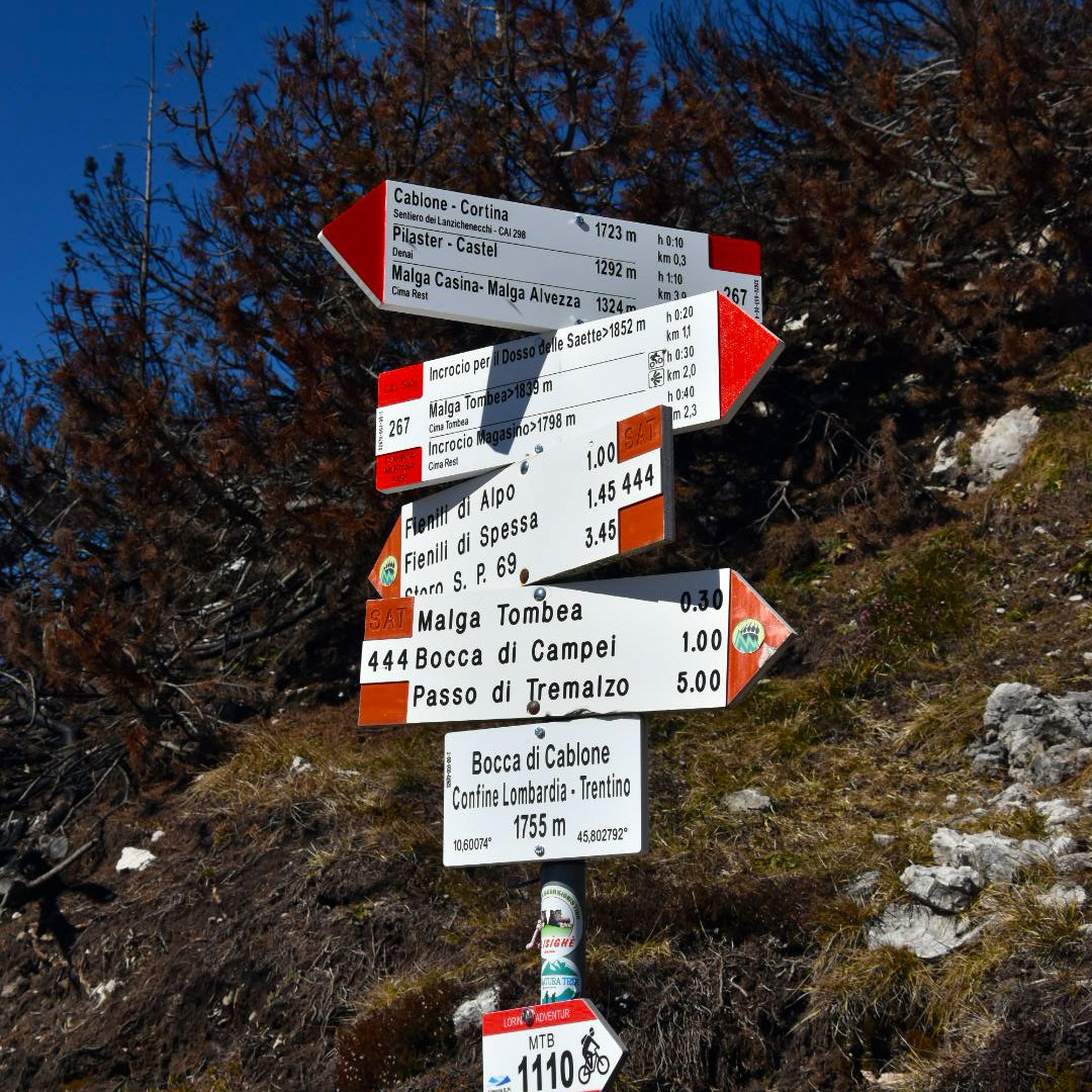 Per il rientro abbiamo scelto il sentiero Antonioli (n°444) e l‘Alta Via n°10 Garda- Brenta. Scendete dalla vetta ripercorrendo a ritroso il sentiero fino a Malga Tombea. Lasciandovela alle spalle continuate sul largo sentiero Antonioli fino alla Bocca di Cablone , per circa 2 chilometri. Questo sentiero è ricco di storia e potrete vedere, durante il percorso, molte gallerie della Prima Guerra Mondiale.