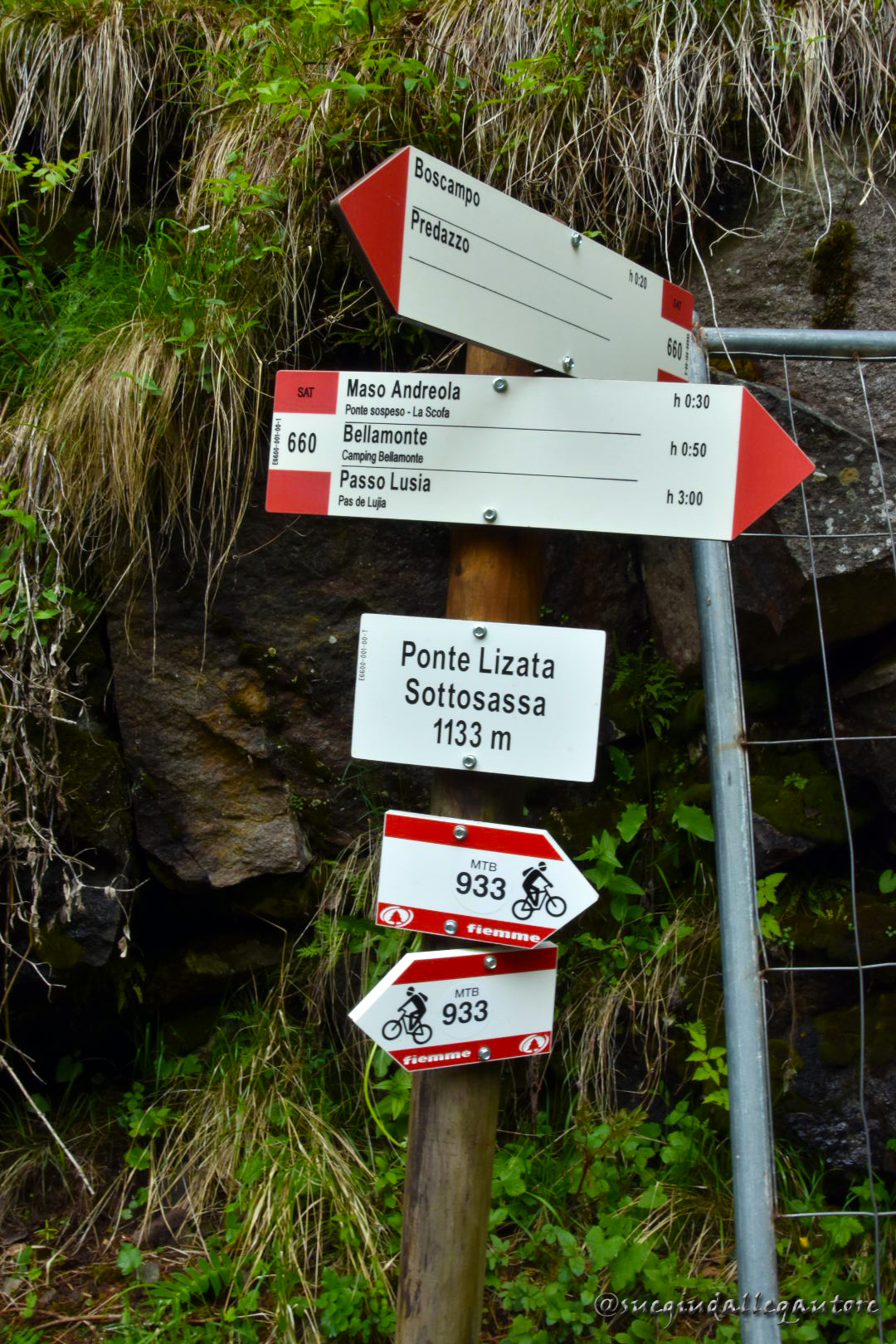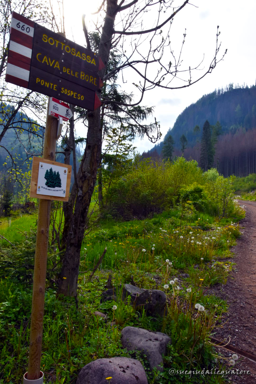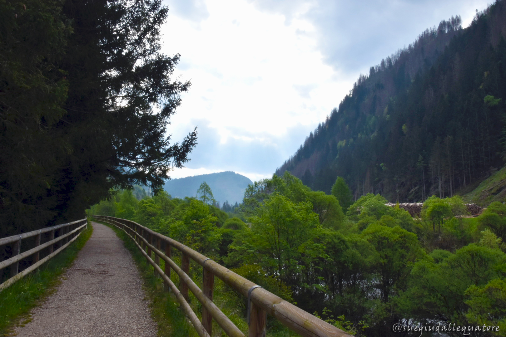 Il sentiero, nel nostro caso, partiva proprio dietro l’area di sosta, accanto al fiume Travignolo. Il numero del sentiero che dovete seguire fino al lago è il 660 (potete tenere come riferimento anche il sentiero bike numero 933). Camminate tenendovi il torrente sulla destra seguendo le indicazioni per Paneveggio fino ad arrivare al campeggio Valleverde. Superatelo ed al successivo bivio tenete la destra.