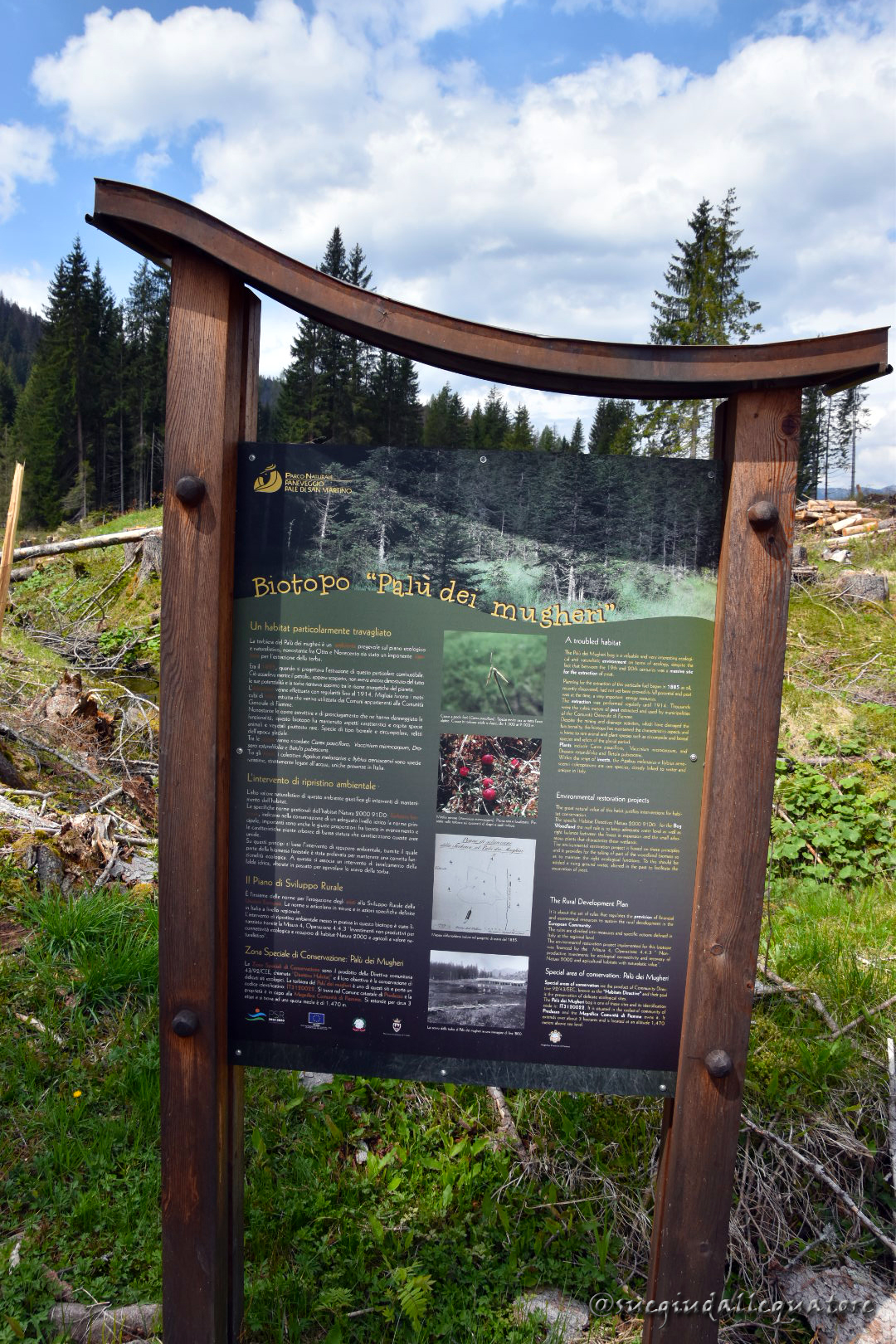 Superate il maso Andreola ed in circa 1,5 Km arriverete in prossimità del Ponte sospeso, che vedrete poco più in basso. Attraversato il ponte vi immetterete nel bosco. Continuate a seguire il sentiero fino ad arrivare al Biotopo “Palù dei Mugheri”. Superate il rudere di una vecchia cascina mantenendovi sempre sul sentiero 660/933 direzione Paneveggio.